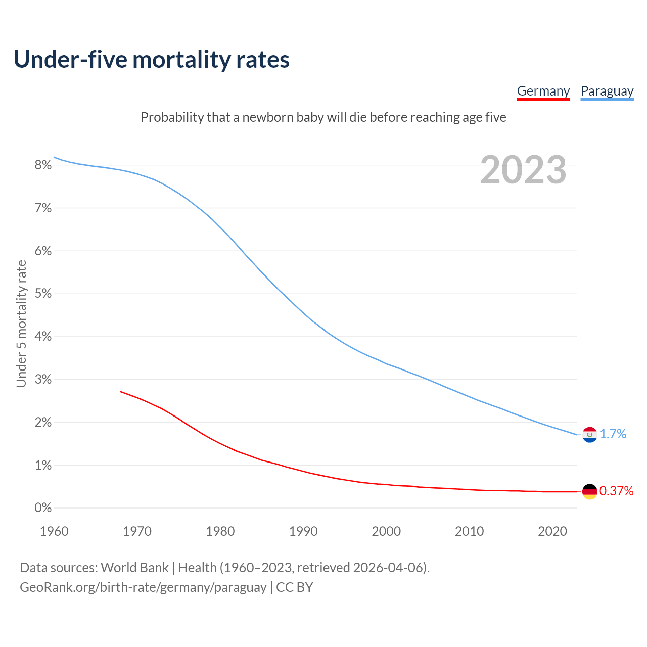 The chance that a newborn baby will die before reaching age five is 0.37% in Germany and 1.7% in Paraguay. Above is a chart with historical data on under-five mortality rates.