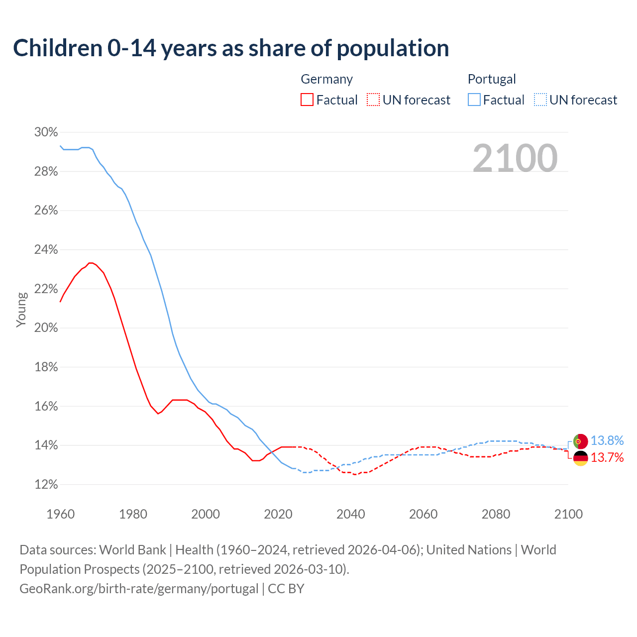 According to the latest available data on birth rates, the fertility rate in Germany was 1.39 children per woman in 2023, compared to 1.44 in Portugal in 2023. The replacement level is considered to be 2.1 children per woman.