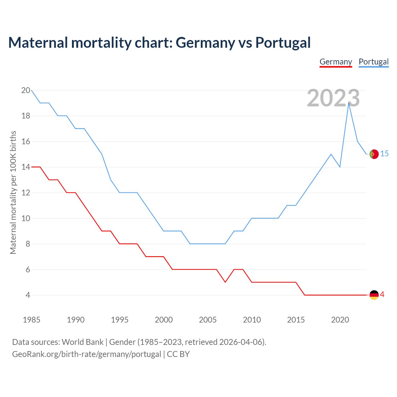 The maternal mortality rate, which is the probability of dying during childbirth or within 42 days of pregnancy termination, is 4 deaths per 100,000 live births in Germany, compared to 15 deaths in Portugal.