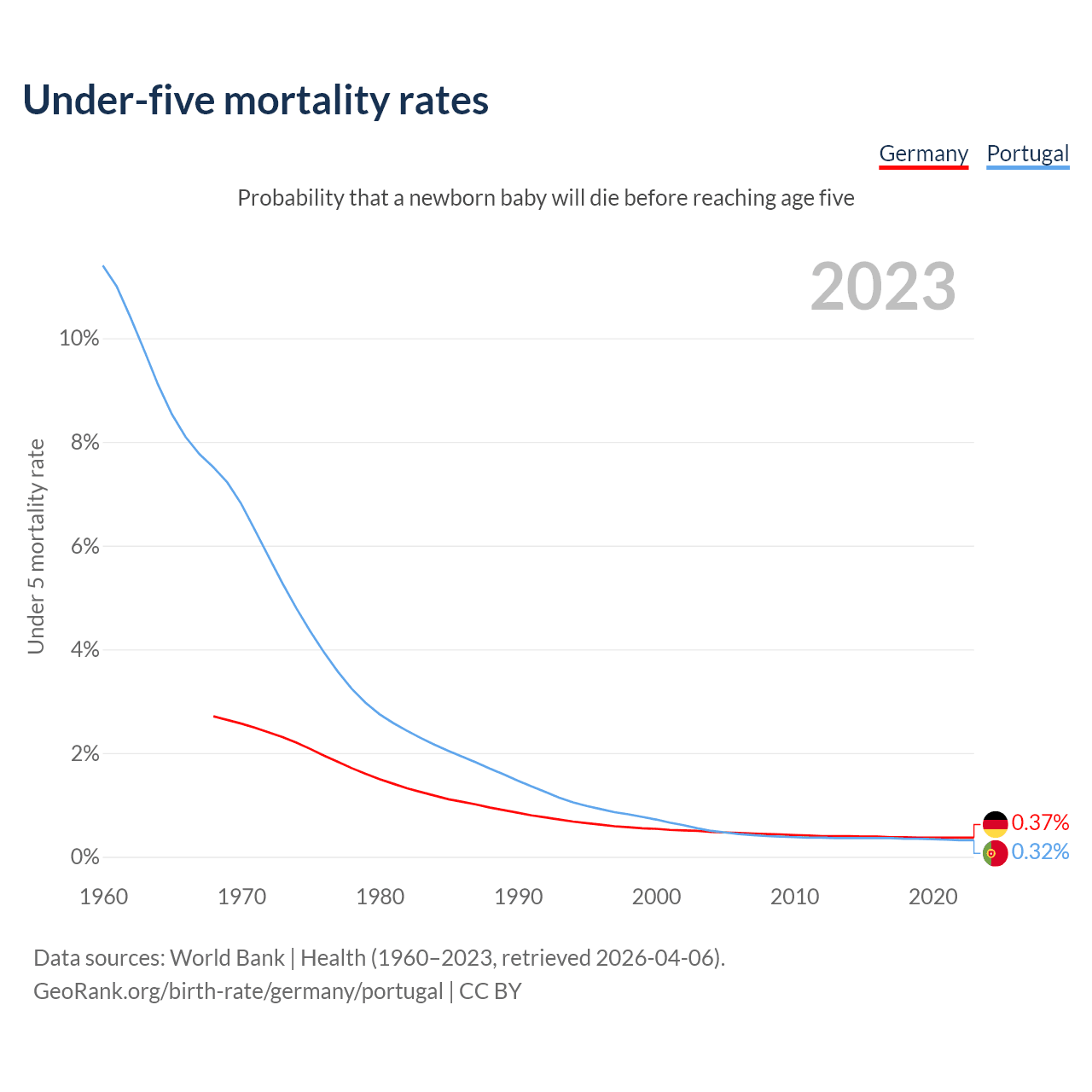 The chance that a newborn baby will die before reaching age five is 0.37% in Germany and 0.32% in Portugal. Above is a chart with historical data on under-five mortality rates.