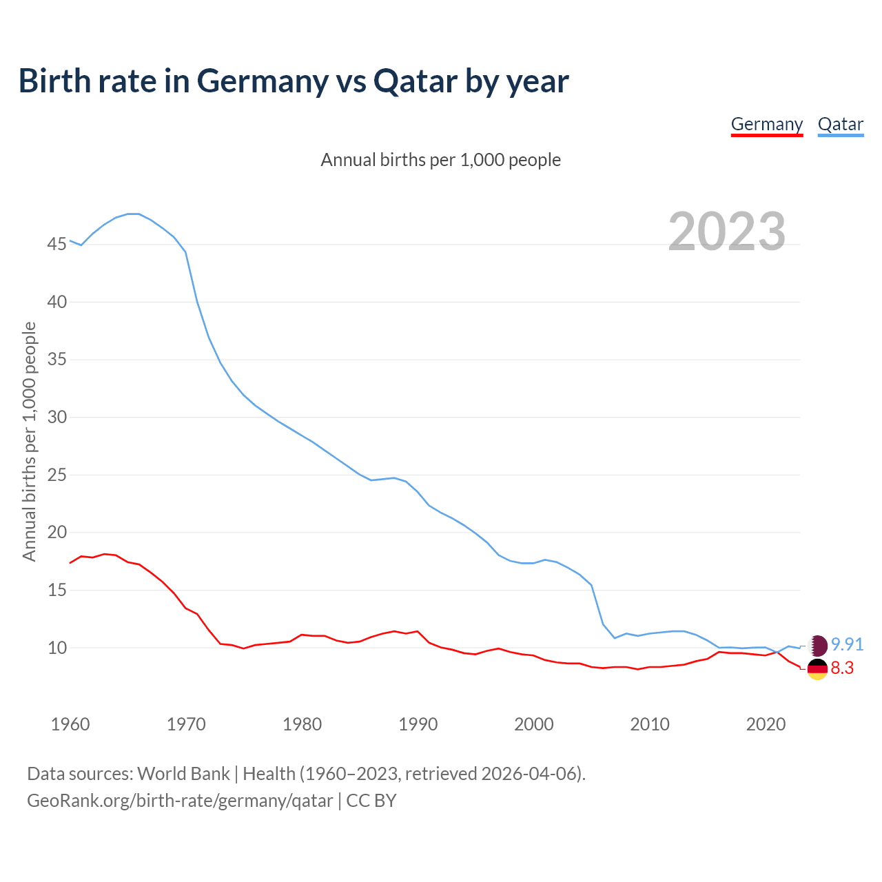 Germany has an annual birth rate of 8.3 births per 1,000 people, compared to 9.91 for Qatar. The average number of children a woman is expected to have during her lifetime — the fertility rate, is 1.39 in Germany and 1.73 in Qatar — 24.4% difference.