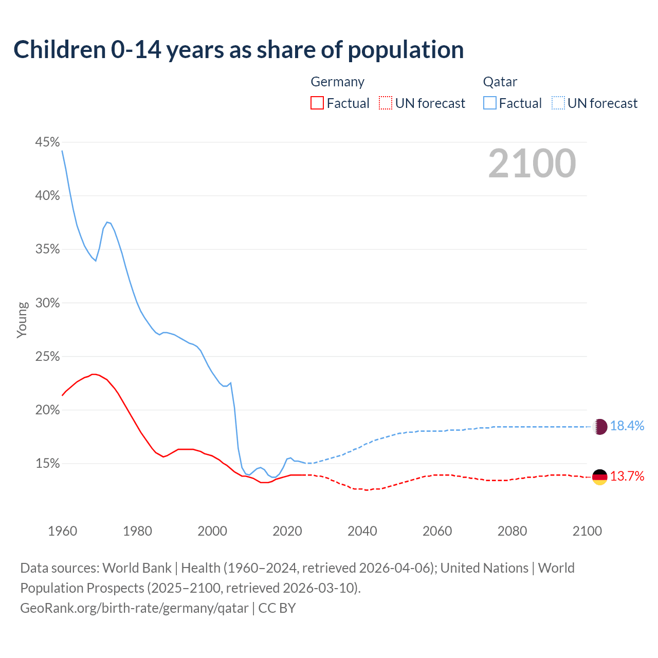 According to the latest available data on birth rates, the fertility rate in Germany was 1.39 children per woman in 2023, compared to 1.73 in Qatar in 2023. The replacement level is considered to be 2.1 children per woman.
