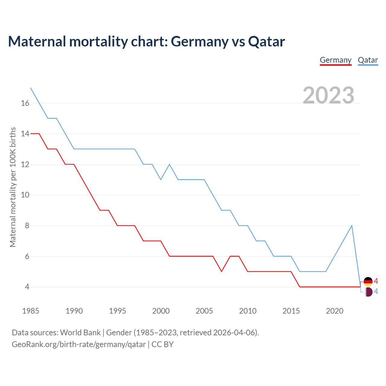 The maternal mortality rate, which is the probability of dying during childbirth or within 42 days of pregnancy termination, is 4 deaths per 100,000 live births in Germany, compared to 4 deaths in Qatar.