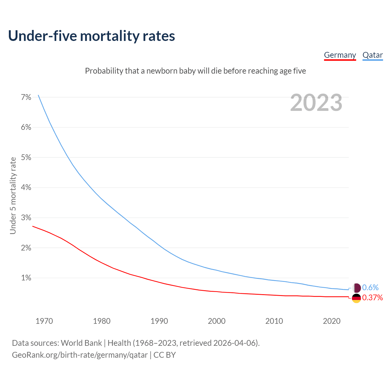 The chance that a newborn baby will die before reaching age five is 0.37% in Germany and 0.6% in Qatar. Above is a chart with historical data on under-five mortality rates.
