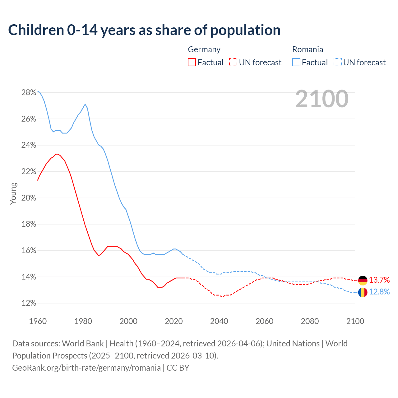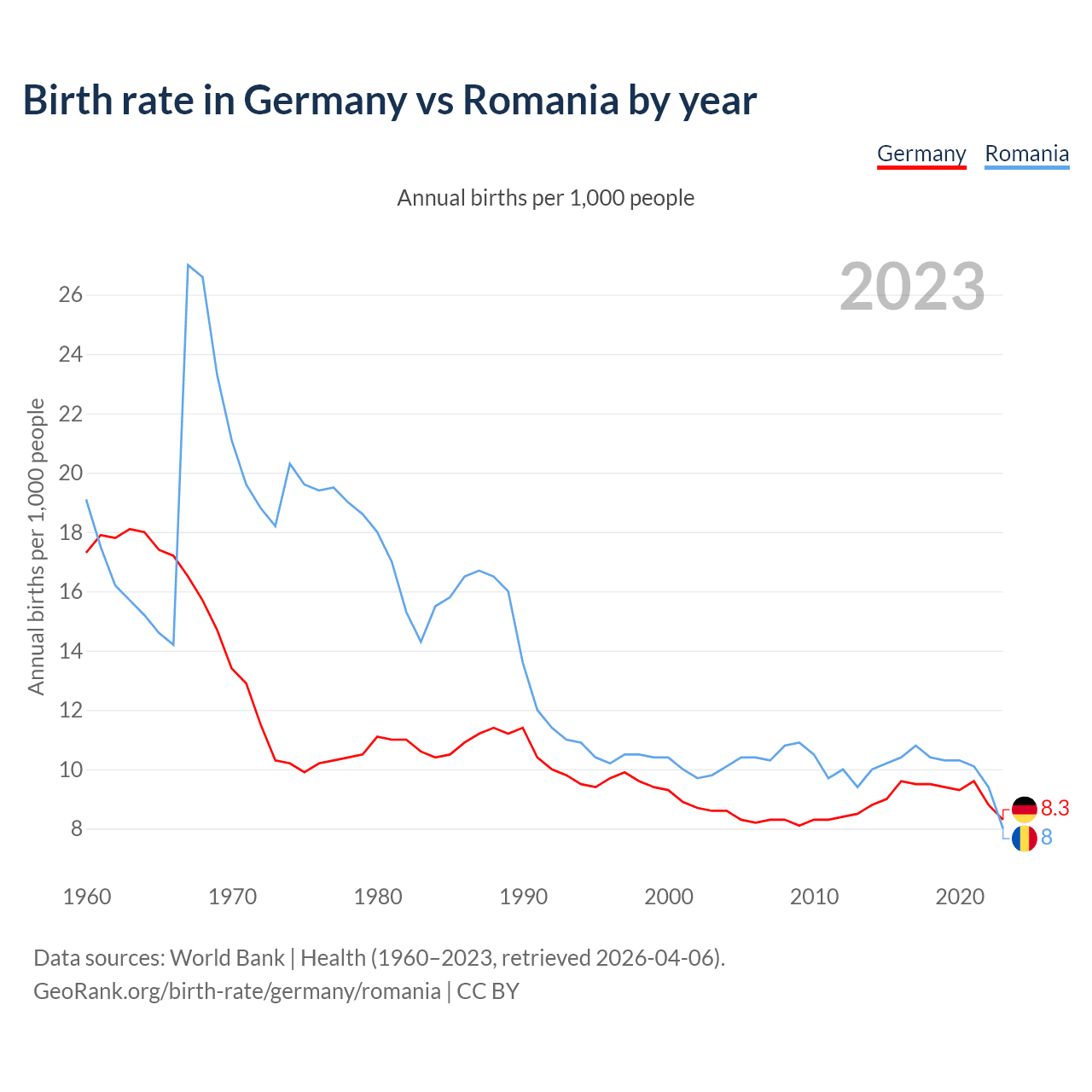 Germany has an annual birth rate of 8.3 births per 1,000 people, compared to 8 for Romania. The average number of children a woman is expected to have during her lifetime — the fertility rate, is 1.39 in Germany and 1.71 in Romania — 23% difference.
