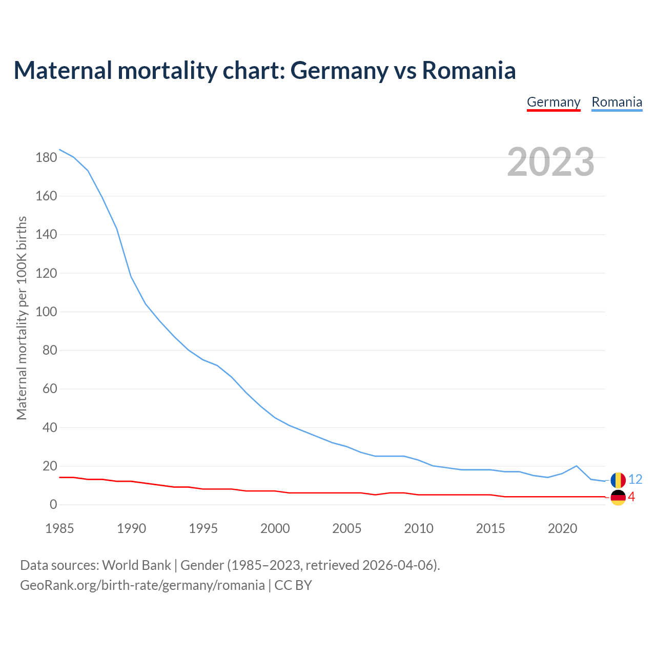 The maternal mortality rate, which is the probability of dying during childbirth or within 42 days of pregnancy termination, is 4 deaths per 100,000 live births in Germany, compared to 12 deaths in Romania.