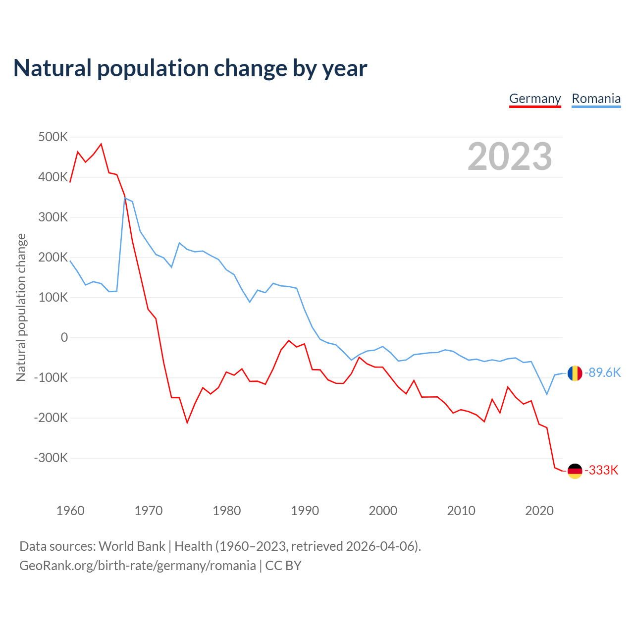 According to the latest available data on birth rates, the fertility rate in Germany was 1.39 children per woman in 2023, compared to 1.71 in Romania in 2023. The replacement level is considered to be 2.1 children per woman.