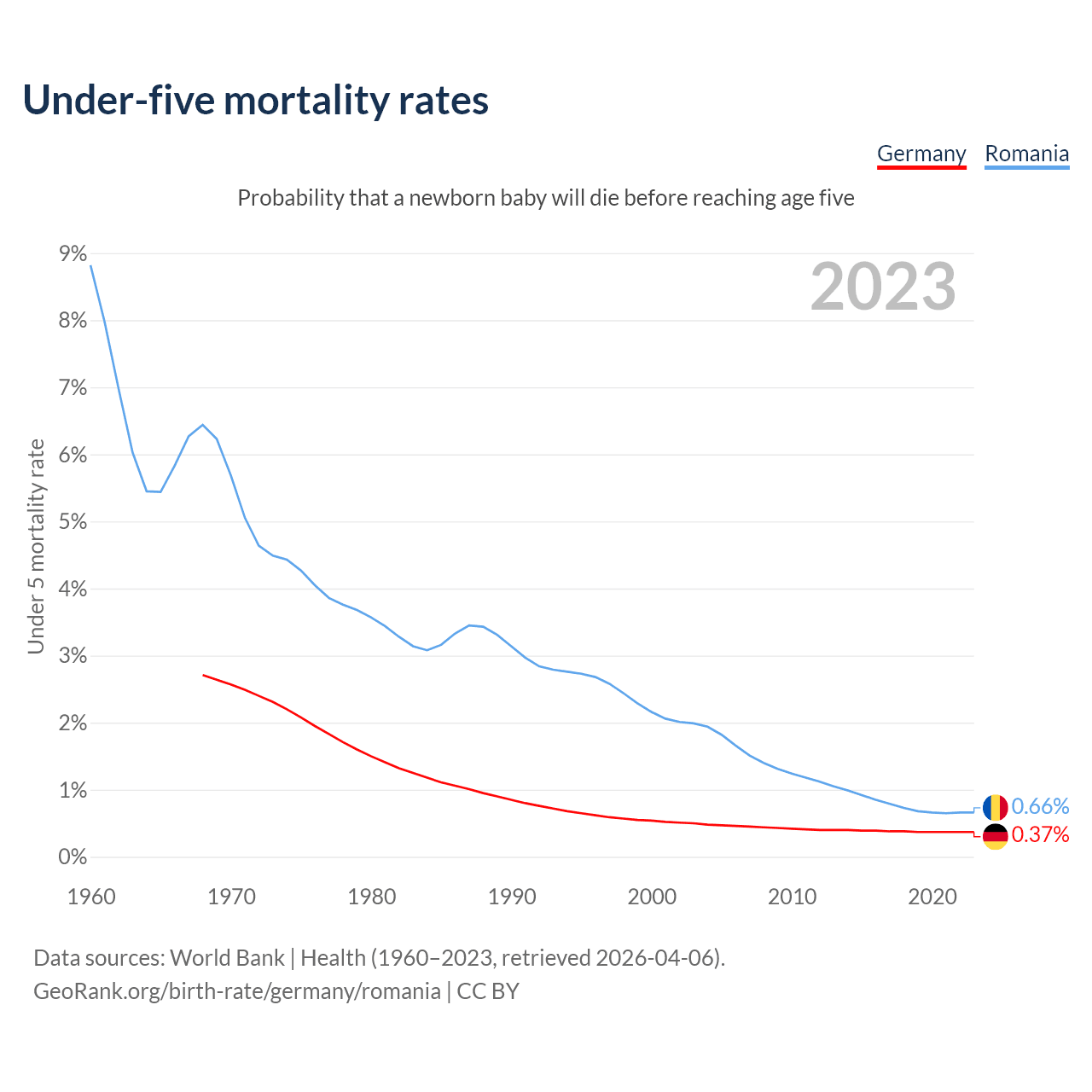 The chance that a newborn baby will die before reaching age five is 0.37% in Germany and 0.66% in Romania. Above is a chart with historical data on under-five mortality rates.