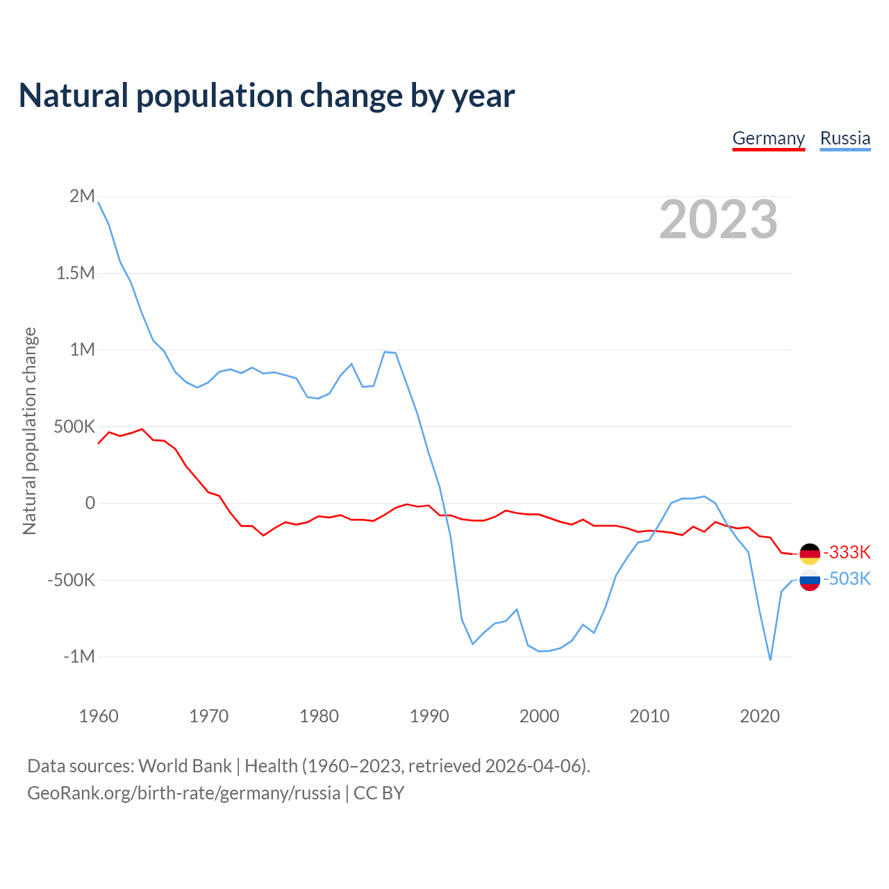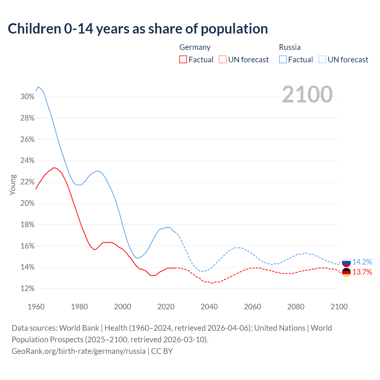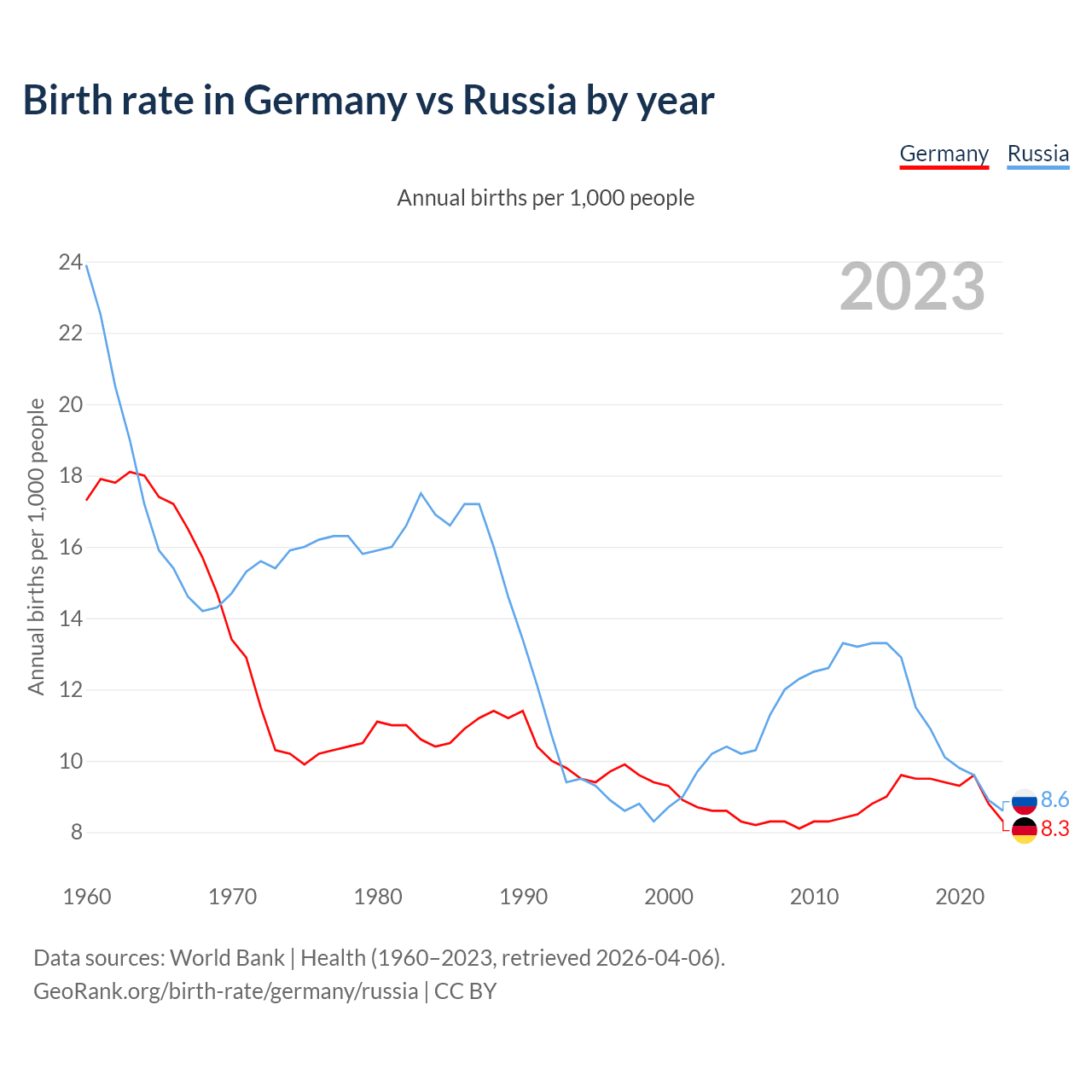 Germany has an annual birth rate of 8.3 births per 1,000 people, compared to 8.6 for Russia. The average number of children a woman is expected to have during her lifetime — the fertility rate, is 1.39 in Germany and 1.41 in Russia — 1.44% difference.