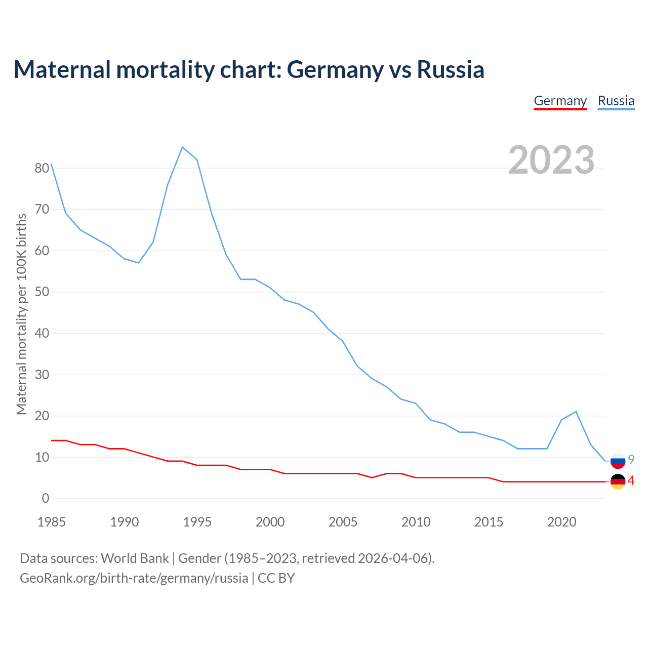 The maternal mortality rate, which is the probability of dying during childbirth or within 42 days of pregnancy termination, is 4 deaths per 100,000 live births in Germany, compared to 9 deaths in Russia.