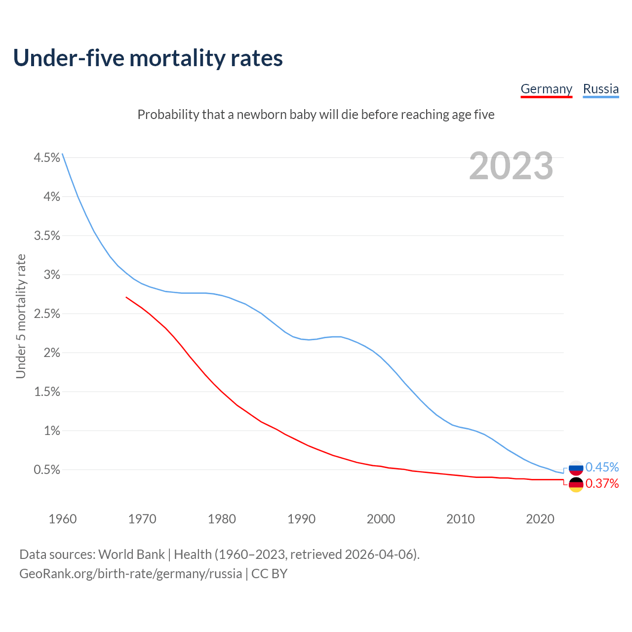 The chance that a newborn baby will die before reaching age five is 0.37% in Germany and 0.45% in Russia. Above is a chart with historical data on under-five mortality rates.