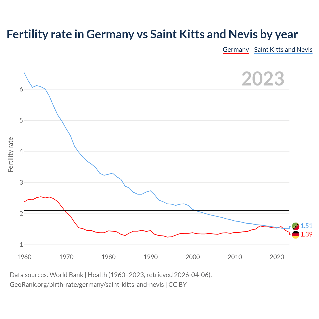 1960 vs 2023, the fertility rate has decreased by 41.4% in Germany and by 77% in Saint Kitts and Nevis — in 1960, it was 2.37 and 6.54, respectively.