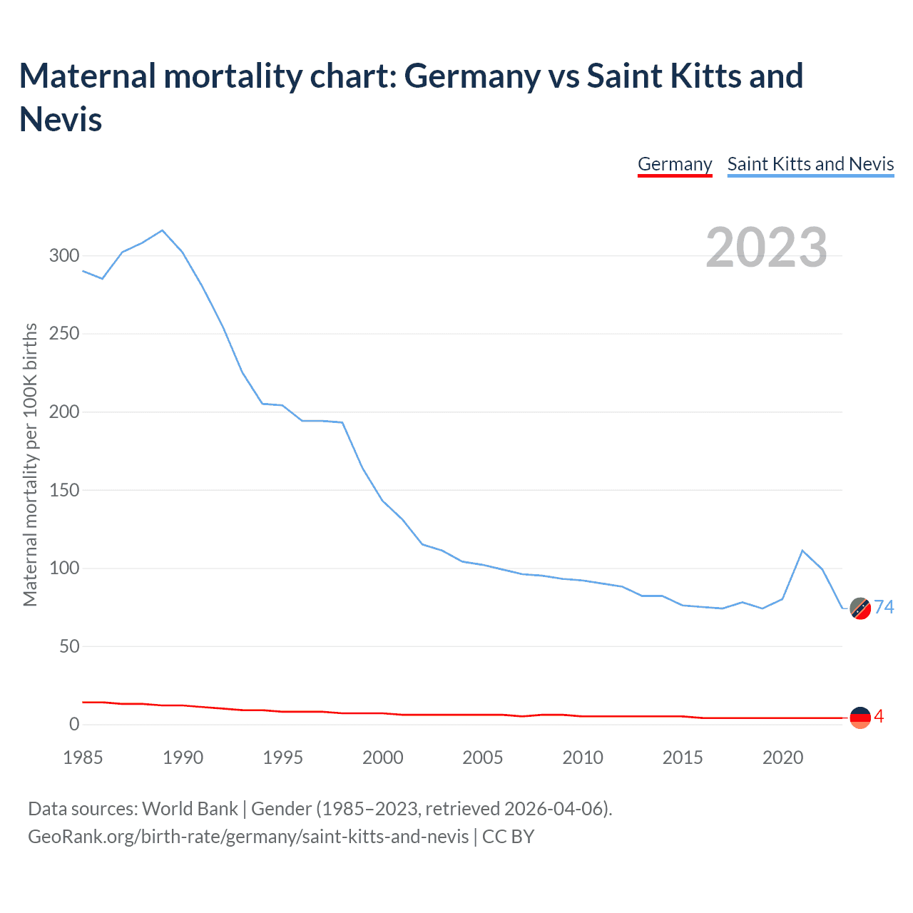 The maternal mortality rate, which is the probability of dying during childbirth or within 42 days of pregnancy termination, is 4 deaths per 100,000 live births in Germany, compared to 74 deaths in Saint Kitts and Nevis.