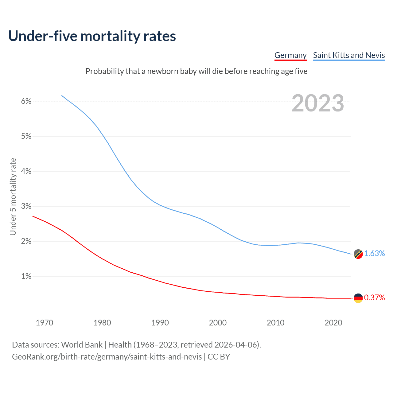 The chance that a newborn baby will die before reaching age five is 0.37% in Germany and 1.63% in Saint Kitts and Nevis. Above is a chart with historical data on under-five mortality rates.