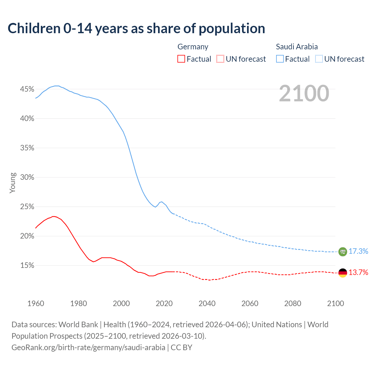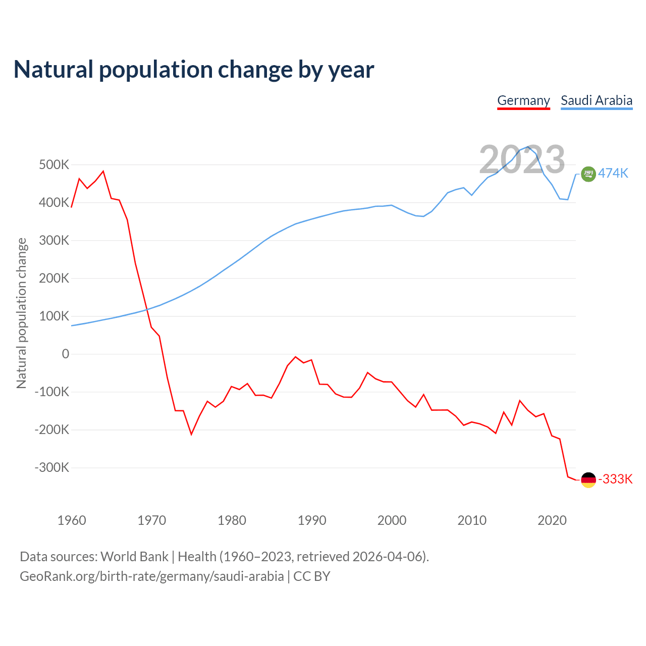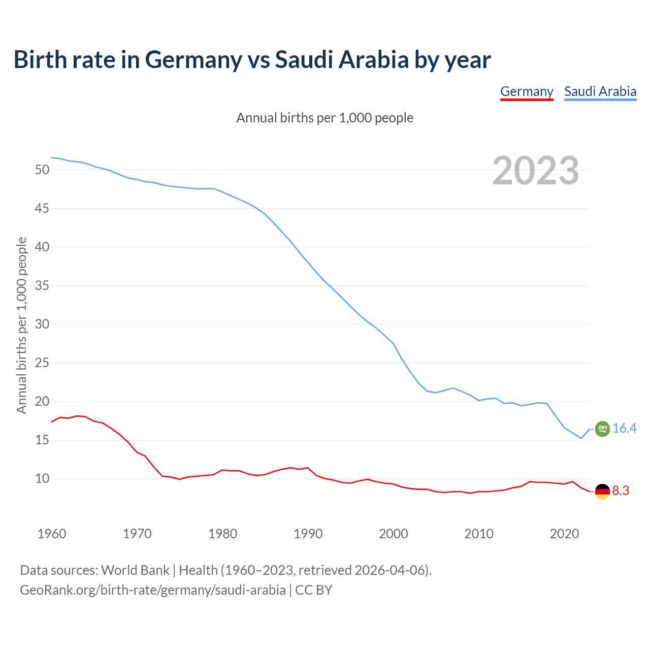 Germany has an annual birth rate of 8.3 births per 1,000 people, compared to 16.4 for Saudi Arabia. The average number of children a woman is expected to have during her lifetime — the fertility rate, is 1.39 in Germany and 2.28 in Saudi Arabia — 64% difference.