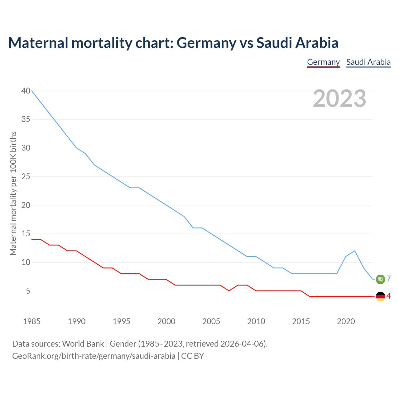 The maternal mortality rate, which is the probability of dying during childbirth or within 42 days of pregnancy termination, is 4 deaths per 100,000 live births in Germany, compared to 7 deaths in Saudi Arabia.