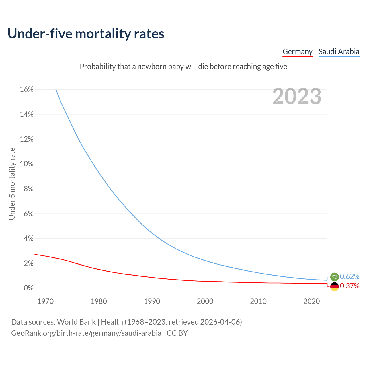 The chance that a newborn baby will die before reaching age five is 0.37% in Germany and 0.62% in Saudi Arabia. Above is a chart with historical data on under-five mortality rates.