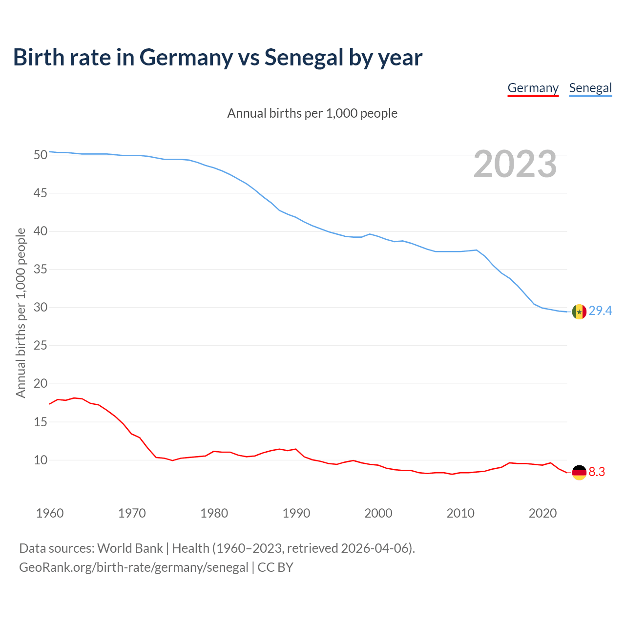 Germany has an annual birth rate of 8.3 births per 1,000 people, compared to 29.4 for Senegal. The average number of children a woman is expected to have during her lifetime — the fertility rate, is 1.39 in Germany and 3.82 in Senegal — 174.7% difference.