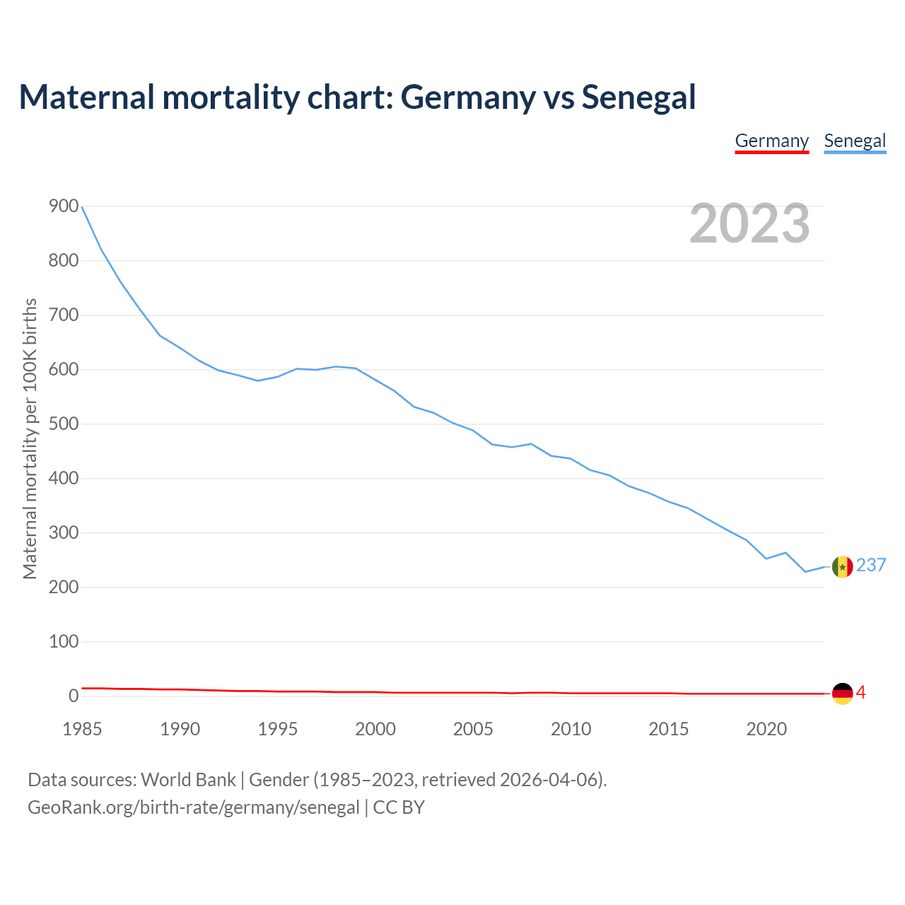 The maternal mortality rate, which is the probability of dying during childbirth or within 42 days of pregnancy termination, is 4 deaths per 100,000 live births in Germany, compared to 237 deaths in Senegal.