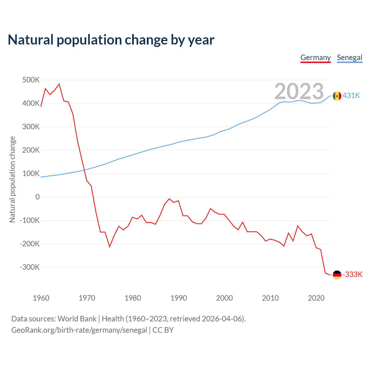 According to the latest available data on birth rates, the fertility rate in Germany was 1.39 children per woman in 2023, compared to 3.82 in Senegal in 2023. The replacement level is considered to be 2.1 children per woman.