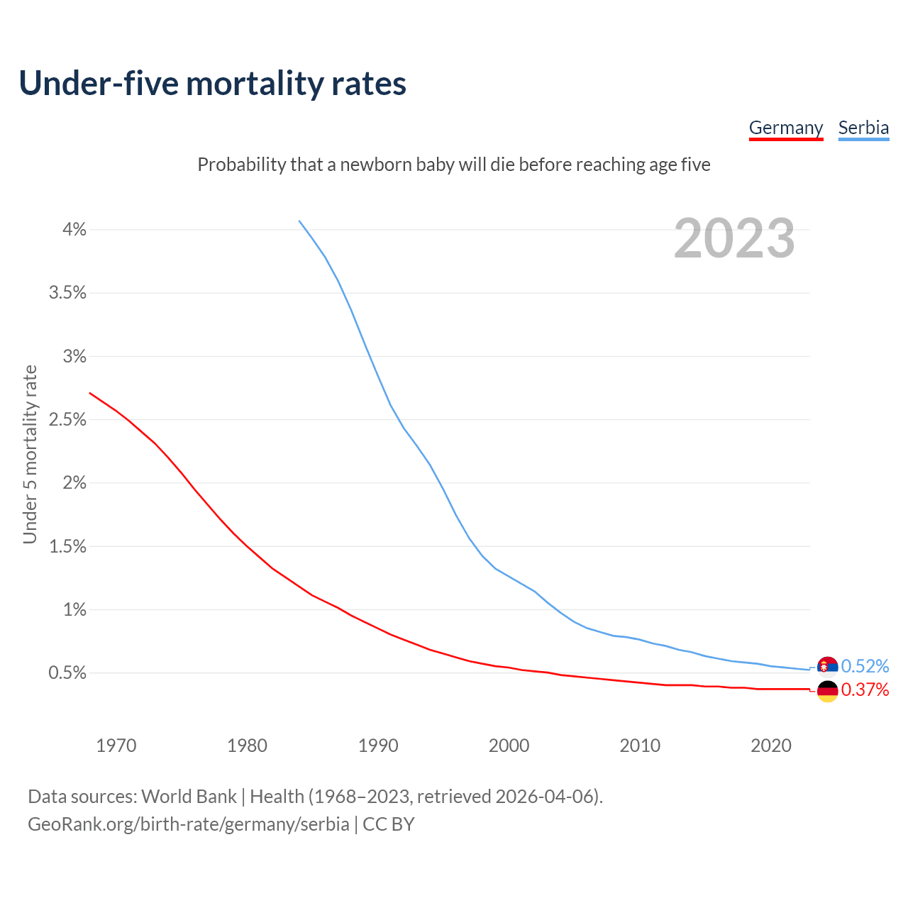 The chance that a newborn baby will die before reaching age five is 0.37% in Germany and 0.52% in Serbia. Above is a chart with historical data on under-five mortality rates.