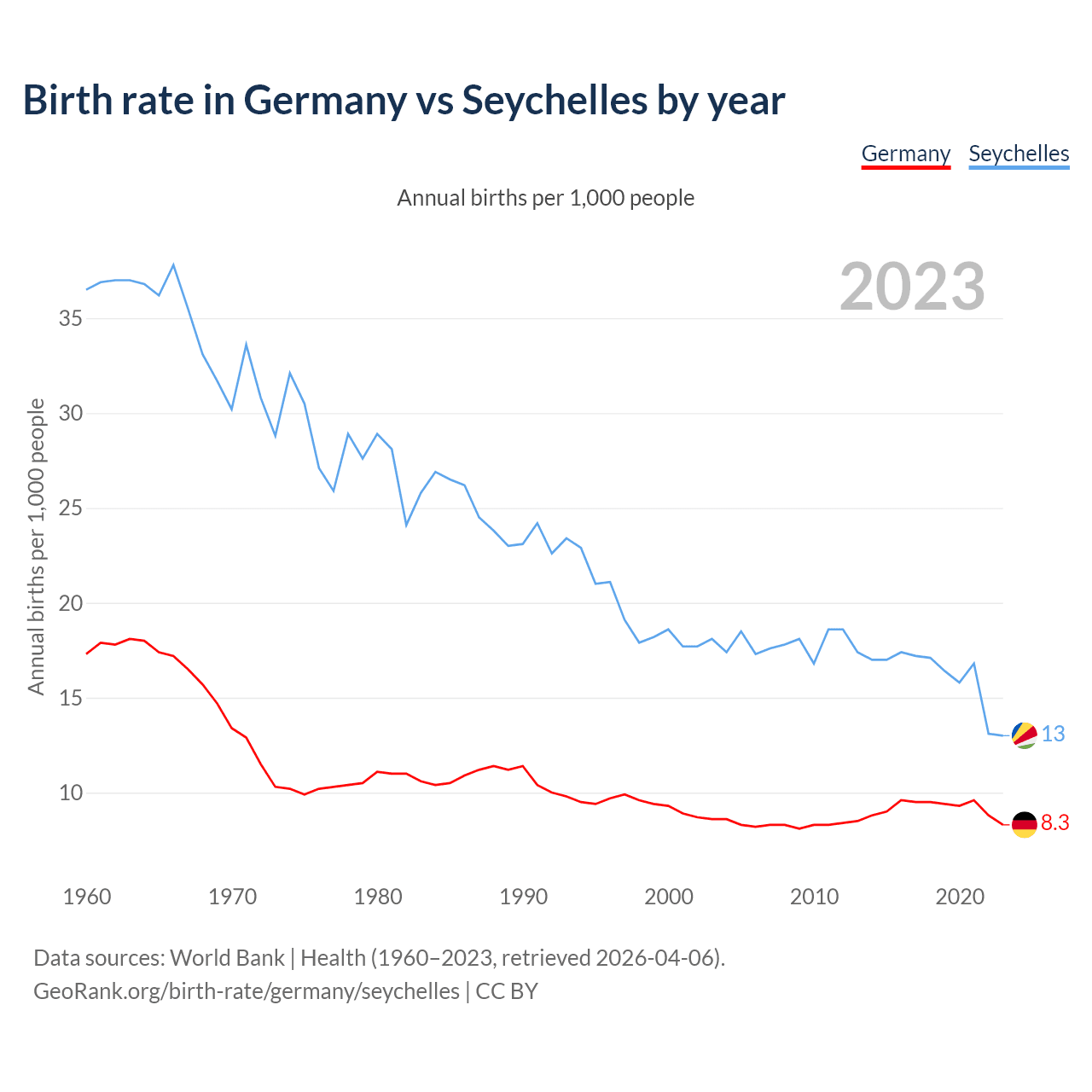 Germany has an annual birth rate of 8.3 births per 1,000 people, compared to 13 for the Seychelles. The average number of children a woman is expected to have during her lifetime — the fertility rate, is 1.39 in Germany and 2.02 in the Seychelles — 45.3% difference.