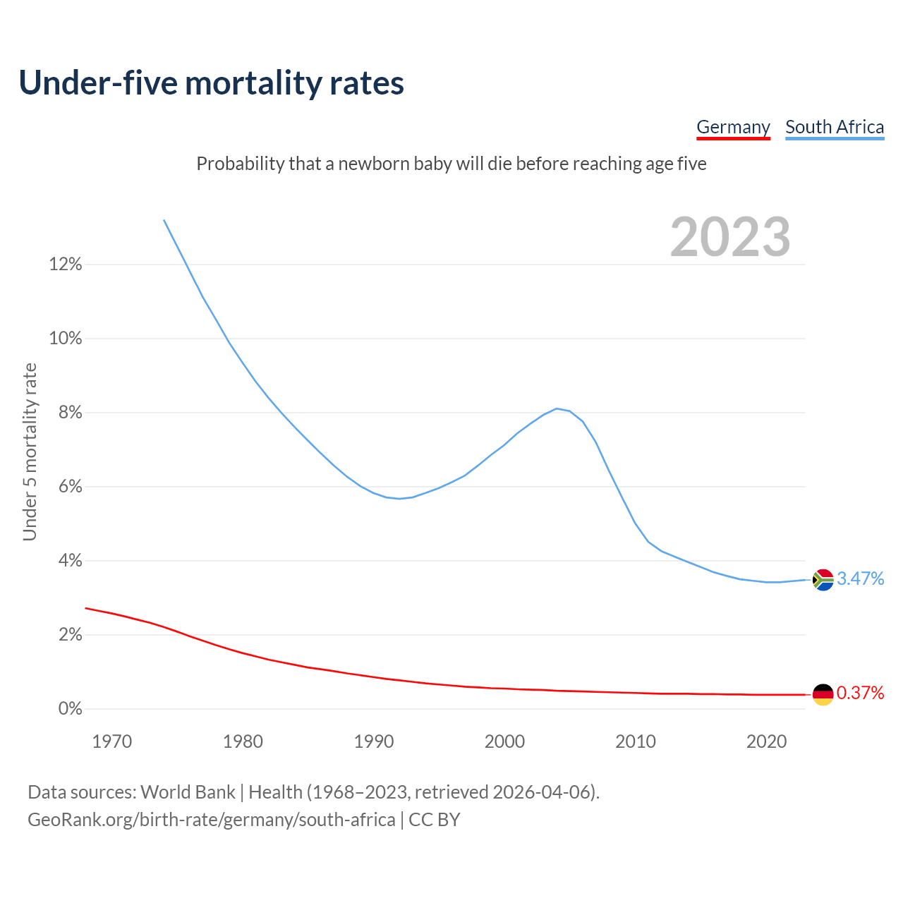The chance that a newborn baby will die before reaching age five is 0.37% in Germany and 3.47% in South Africa. Above is a chart with historical data on under-five mortality rates.