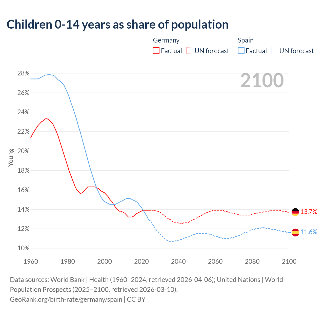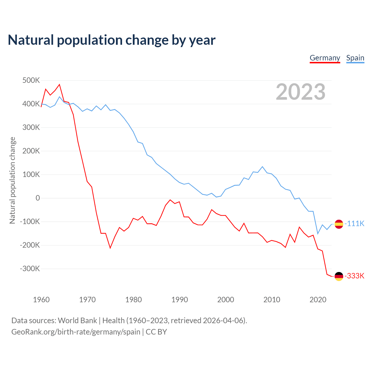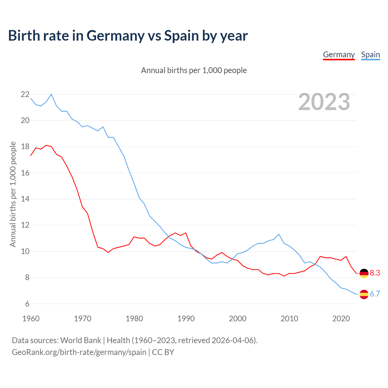 According to the latest available data on birth rates, the fertility rate in Germany was 1.39 children per woman in 2023, compared to 1.12 in Spain in 2023. The replacement level is considered to be 2.1 children per woman.