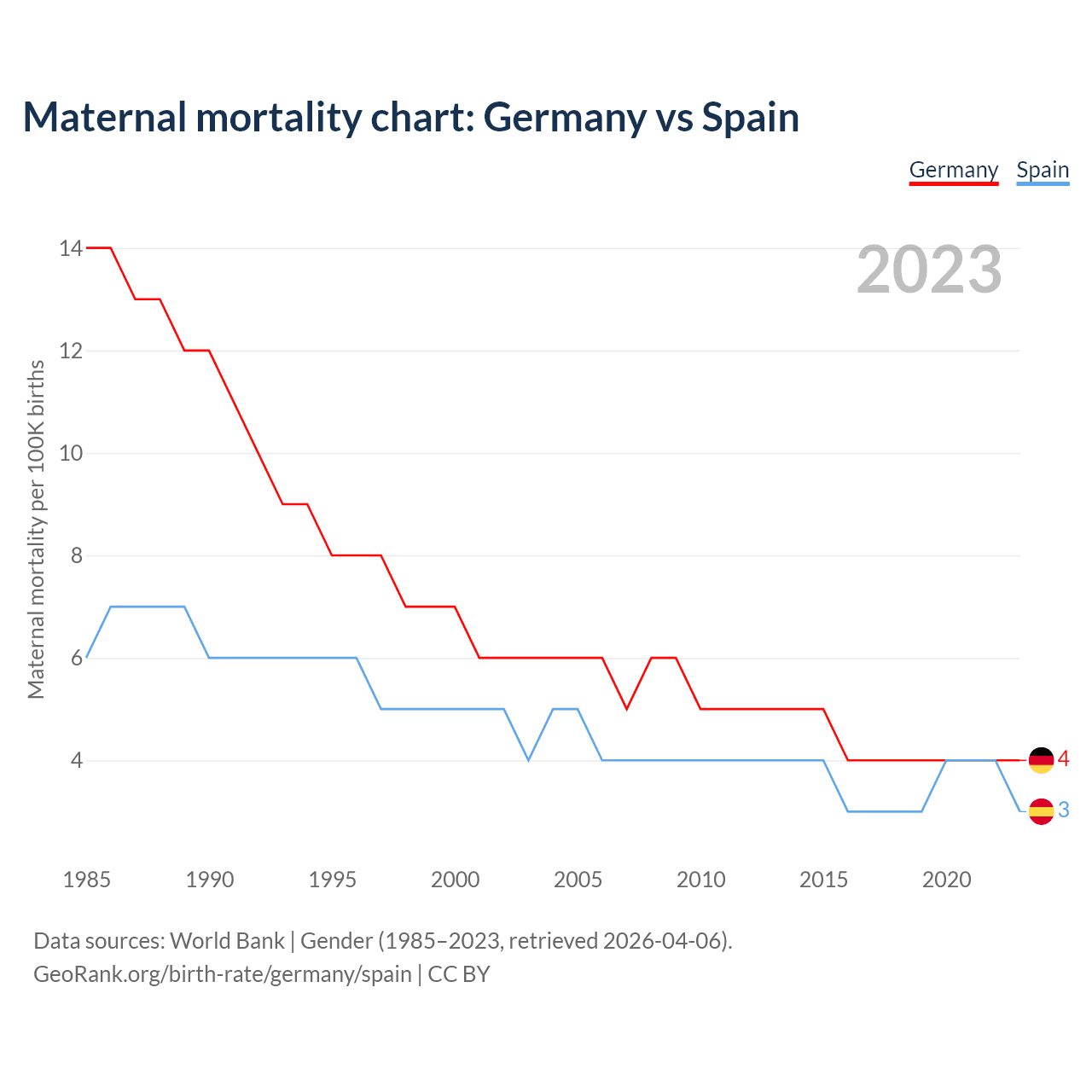 The maternal mortality rate, which is the probability of dying during childbirth or within 42 days of pregnancy termination, is 4 deaths per 100,000 live births in Germany, compared to 3 deaths in Spain.