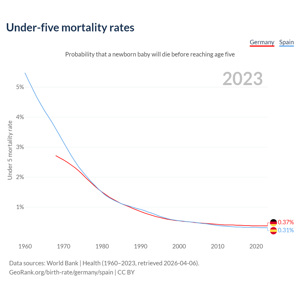 The chance that a newborn baby will die before reaching age five is 0.37% in Germany and 0.31% in Spain. Above is a chart with historical data on under-five mortality rates.