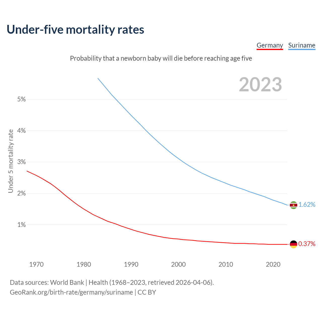 The chance that a newborn baby will die before reaching age five is 0.37% in Germany and 1.62% in Suriname. Above is a chart with historical data on under-five mortality rates.
