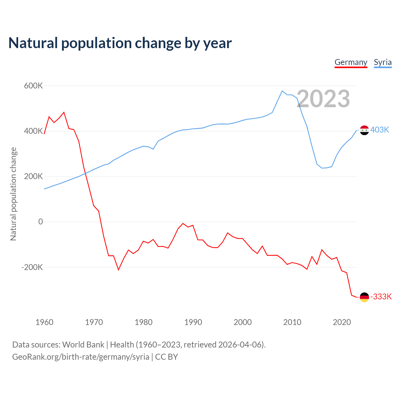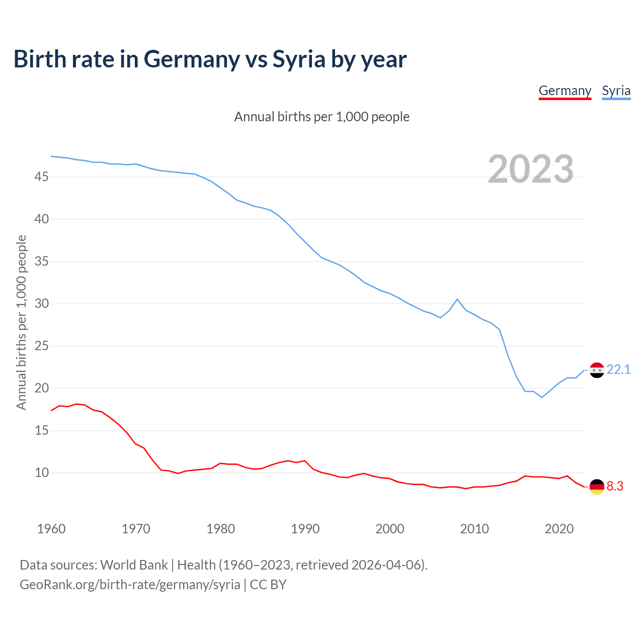 According to the latest available data on birth rates, the fertility rate in Germany was 1.39 children per woman in 2023, compared to 2.71 in Syria in 2023. The replacement level is considered to be 2.1 children per woman.