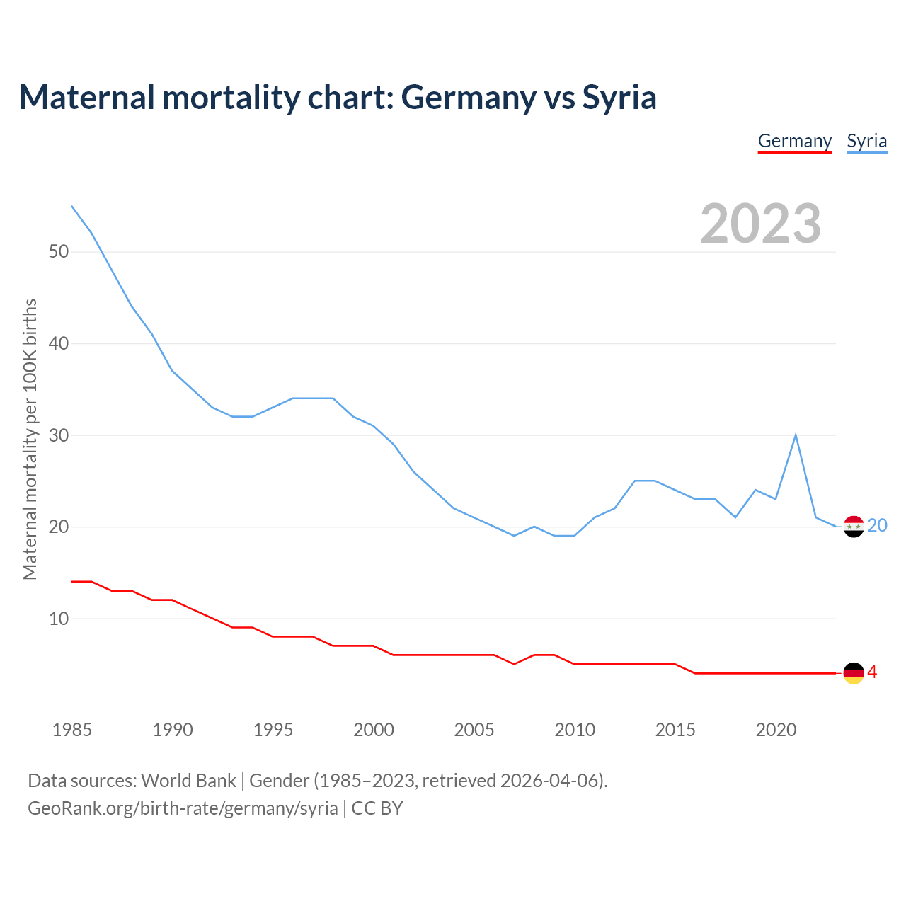 The maternal mortality rate, which is the probability of dying during childbirth or within 42 days of pregnancy termination, is 4 deaths per 100,000 live births in Germany, compared to 20 deaths in Syria.