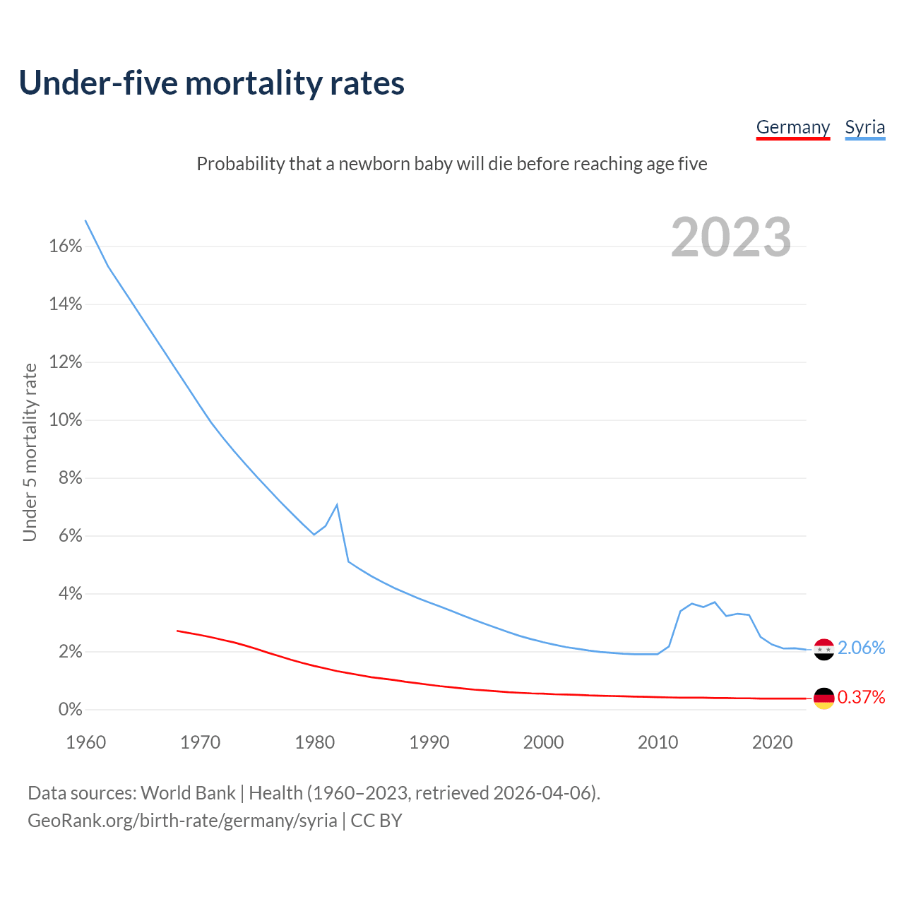 The chance that a newborn baby will die before reaching age five is 0.37% in Germany and 2.06% in Syria. Above is a chart with historical data on under-five mortality rates.