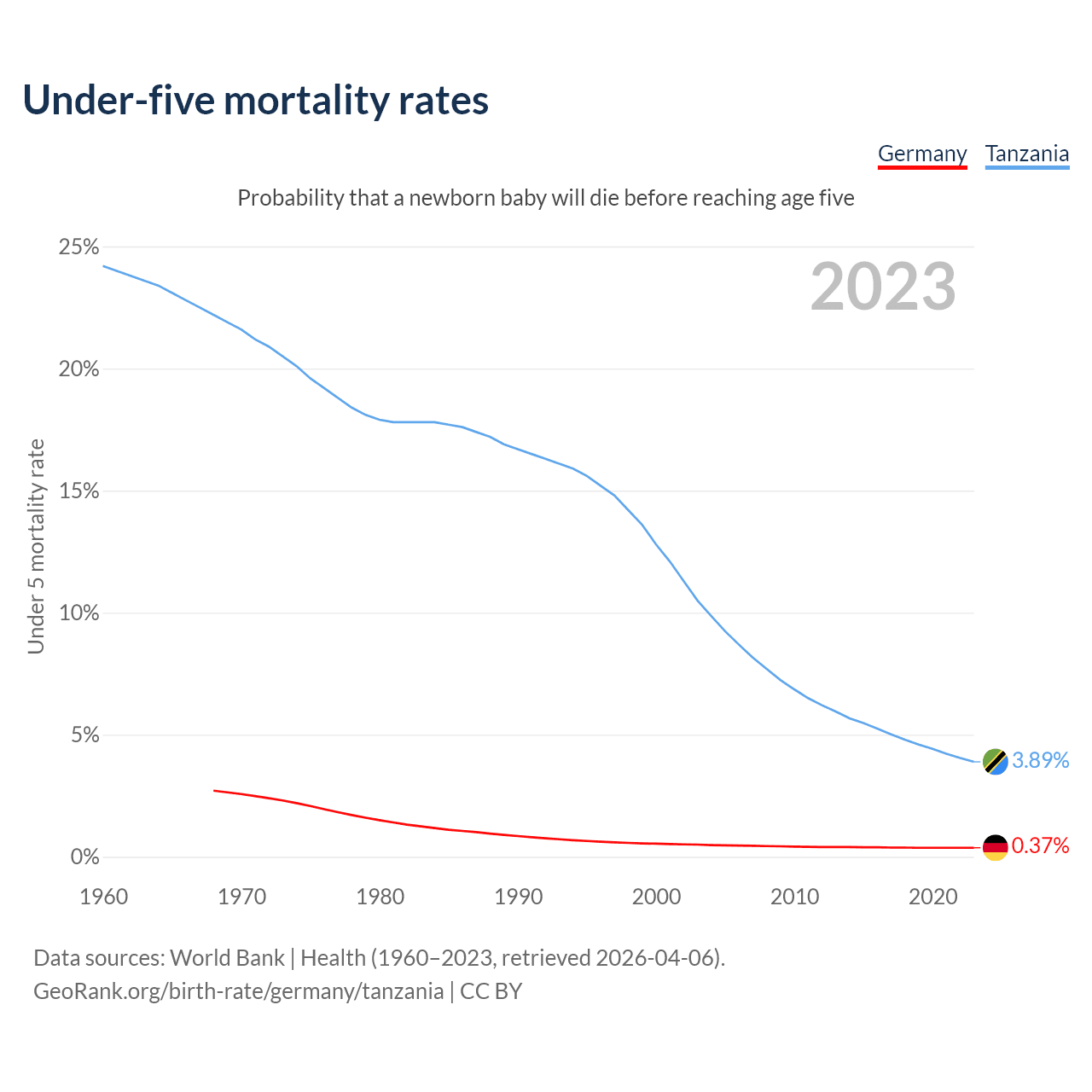 The chance that a newborn baby will die before reaching age five is 0.37% in Germany and 3.89% in Tanzania. Above is a chart with historical data on under-five mortality rates.