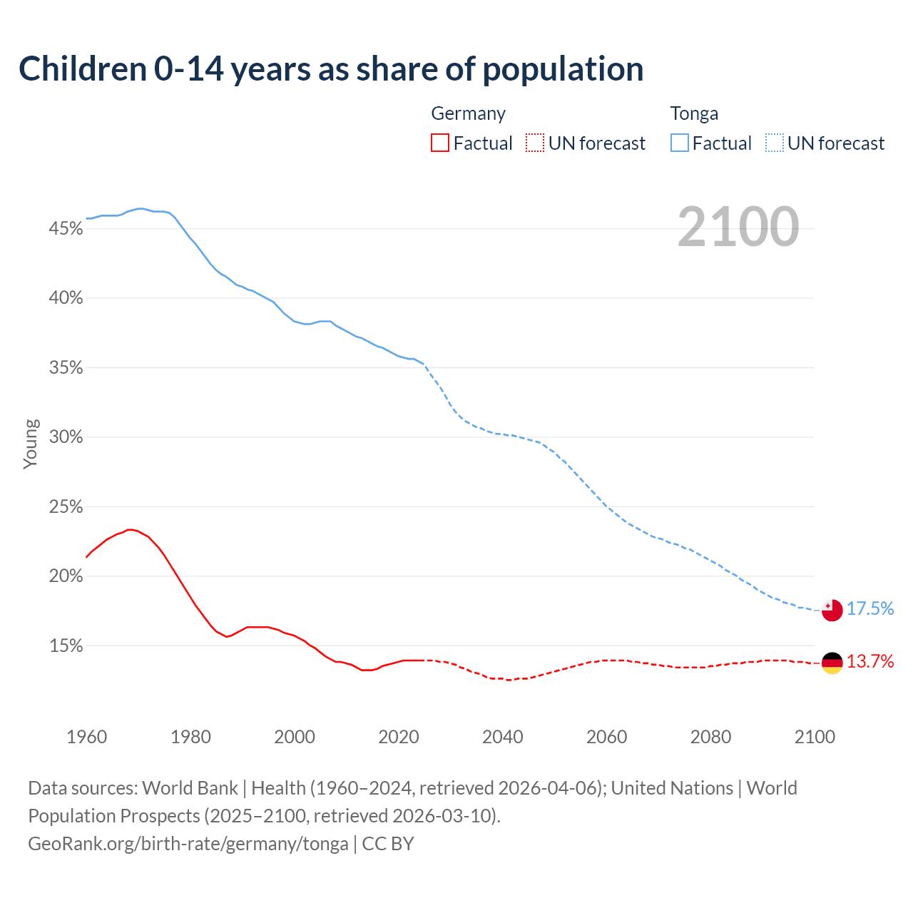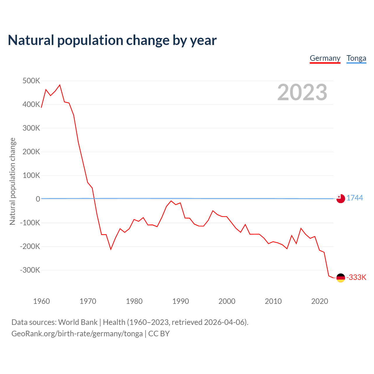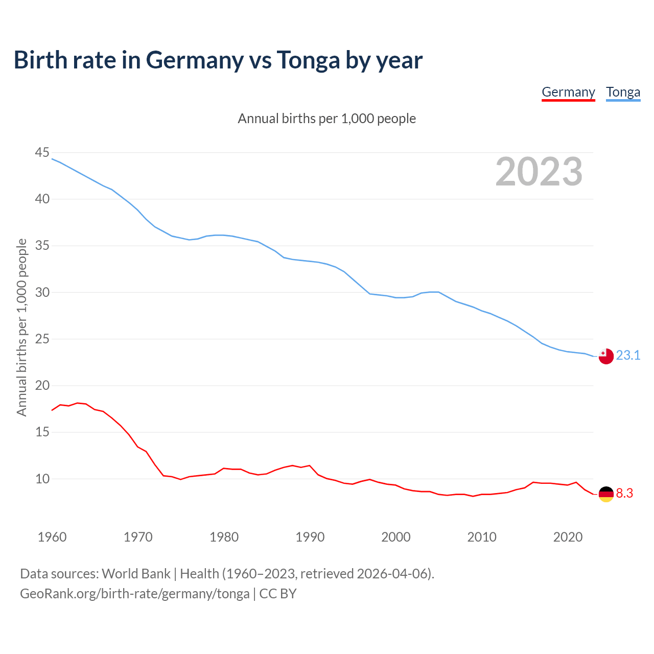 Germany has an annual birth rate of 8.3 births per 1,000 people, compared to 23.1 for Tonga. The average number of children a woman is expected to have during her lifetime — the fertility rate, is 1.39 in Germany and 3.13 in Tonga — 125.1% difference.
