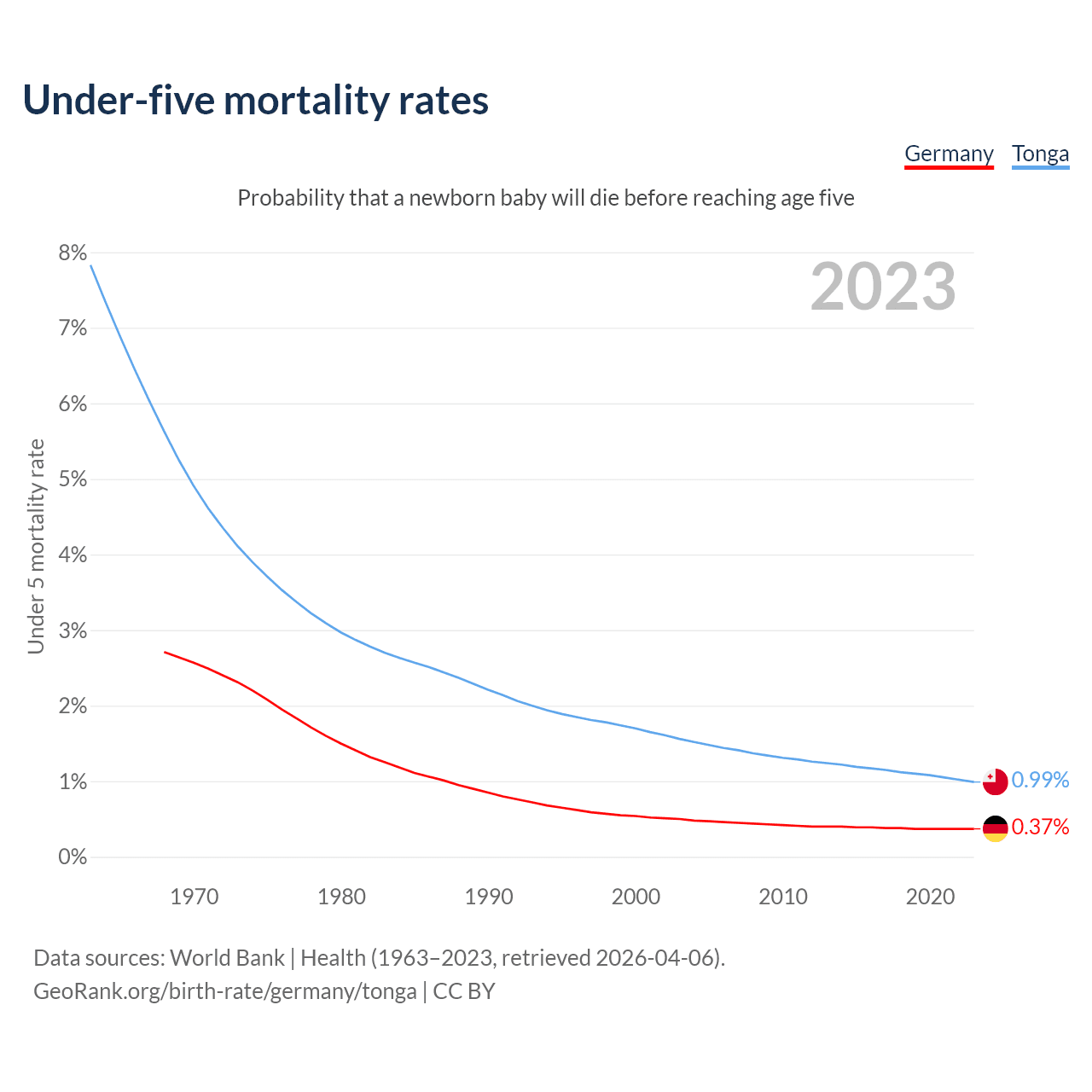 The chance that a newborn baby will die before reaching age five is 0.37% in Germany and 0.99% in Tonga. Above is a chart with historical data on under-five mortality rates.