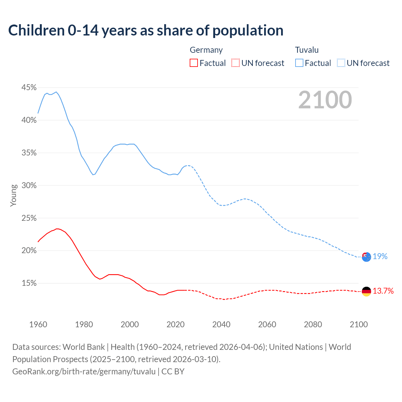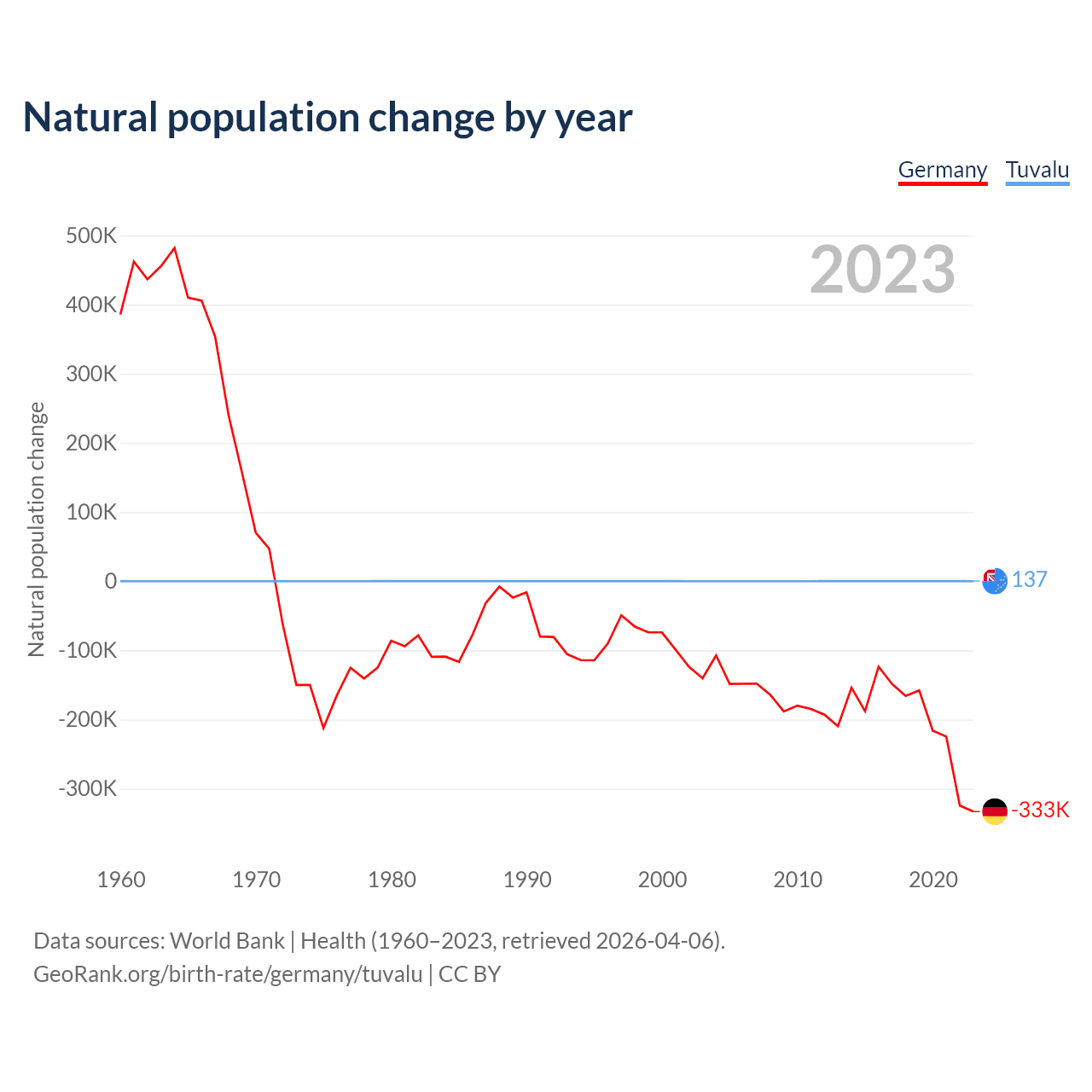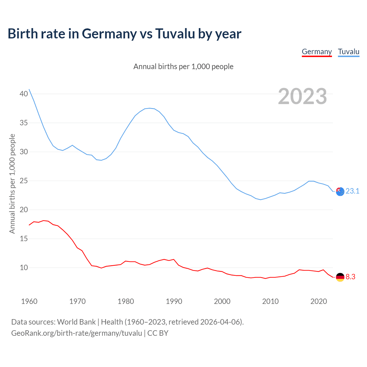 Germany has an annual birth rate of 8.3 births per 1,000 people, compared to 23.1 for Tuvalu. The average number of children a woman is expected to have during her lifetime — the fertility rate, is 1.39 in Germany and 3.21 in Tuvalu — 130.8% difference.