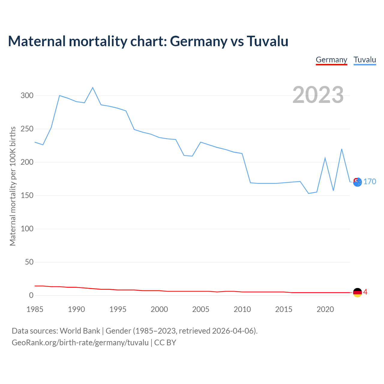 The maternal mortality rate, which is the probability of dying during childbirth or within 42 days of pregnancy termination, is 4 deaths per 100,000 live births in Germany, compared to 170 deaths in Tuvalu.