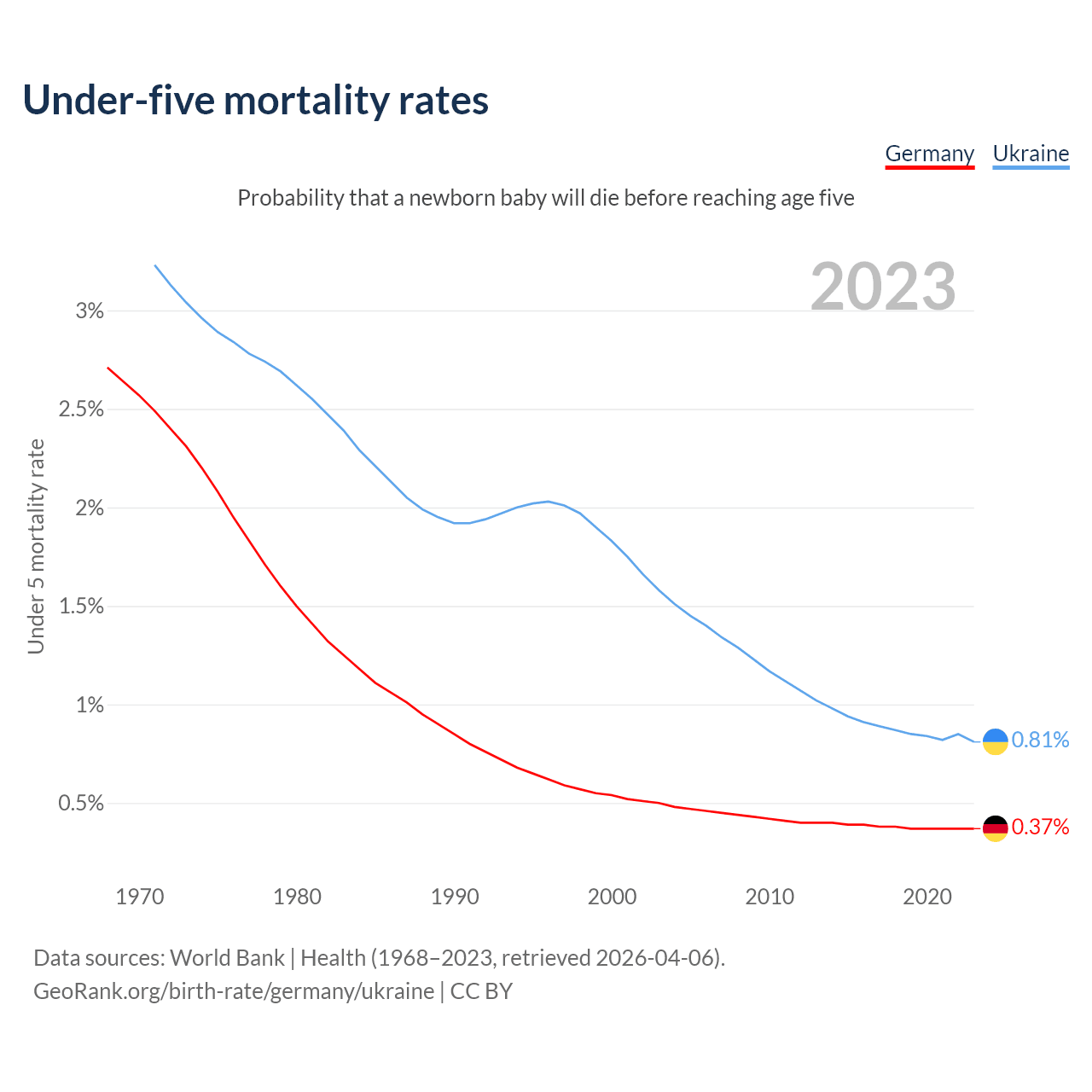 The chance that a newborn baby will die before reaching age five is 0.37% in Germany and 0.81% in Ukraine. Above is a chart with historical data on under-five mortality rates.