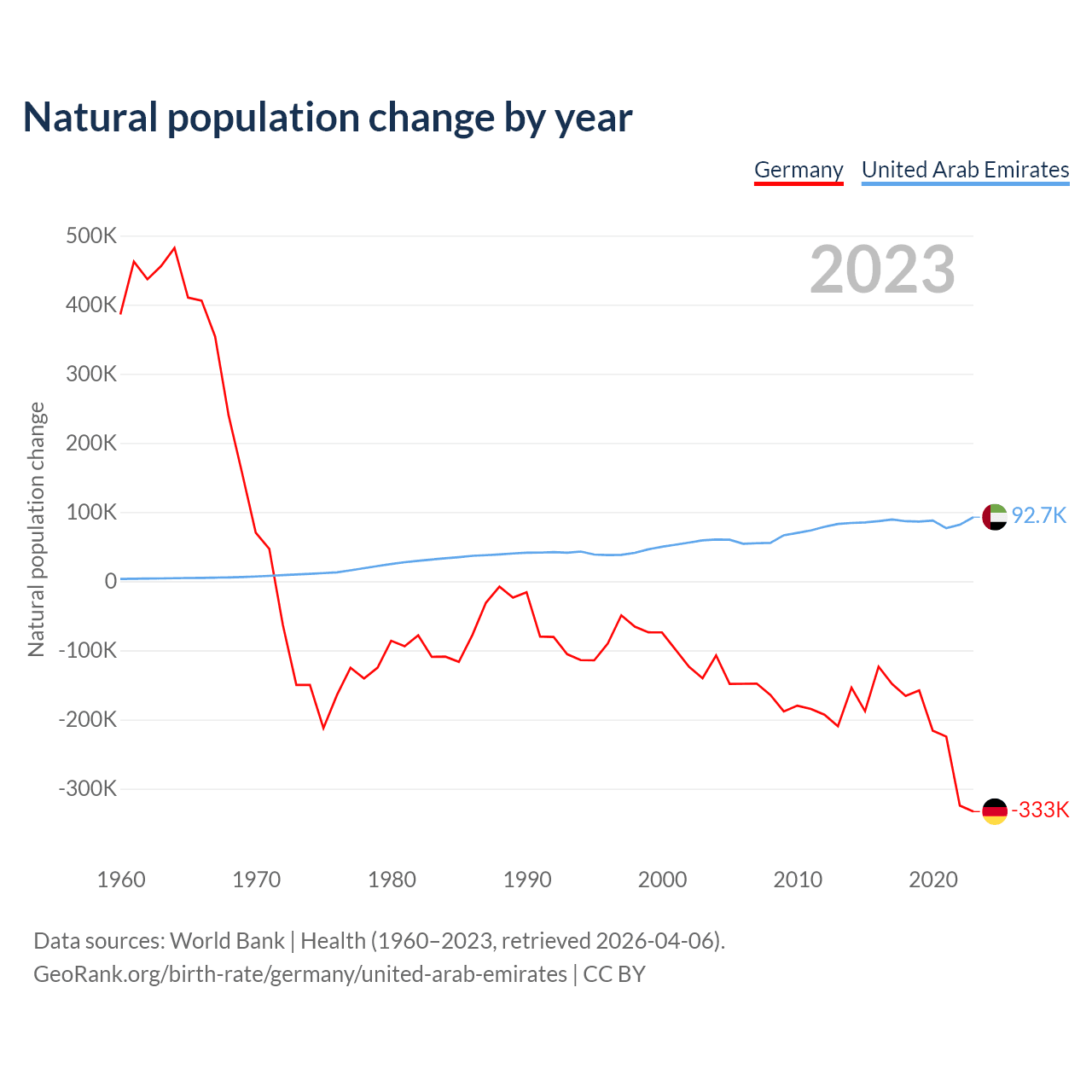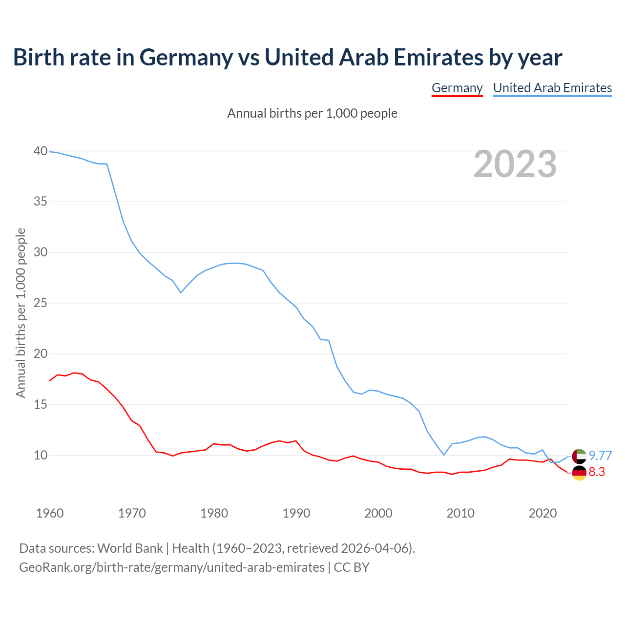 Germany has an annual birth rate of 8.3 births per 1,000 people, compared to 9.77 for the United Arab Emirates. The average number of children a woman is expected to have during her lifetime — the fertility rate, is 1.39 in Germany and 1.2 in the United Arab Emirates — 13.7% difference.