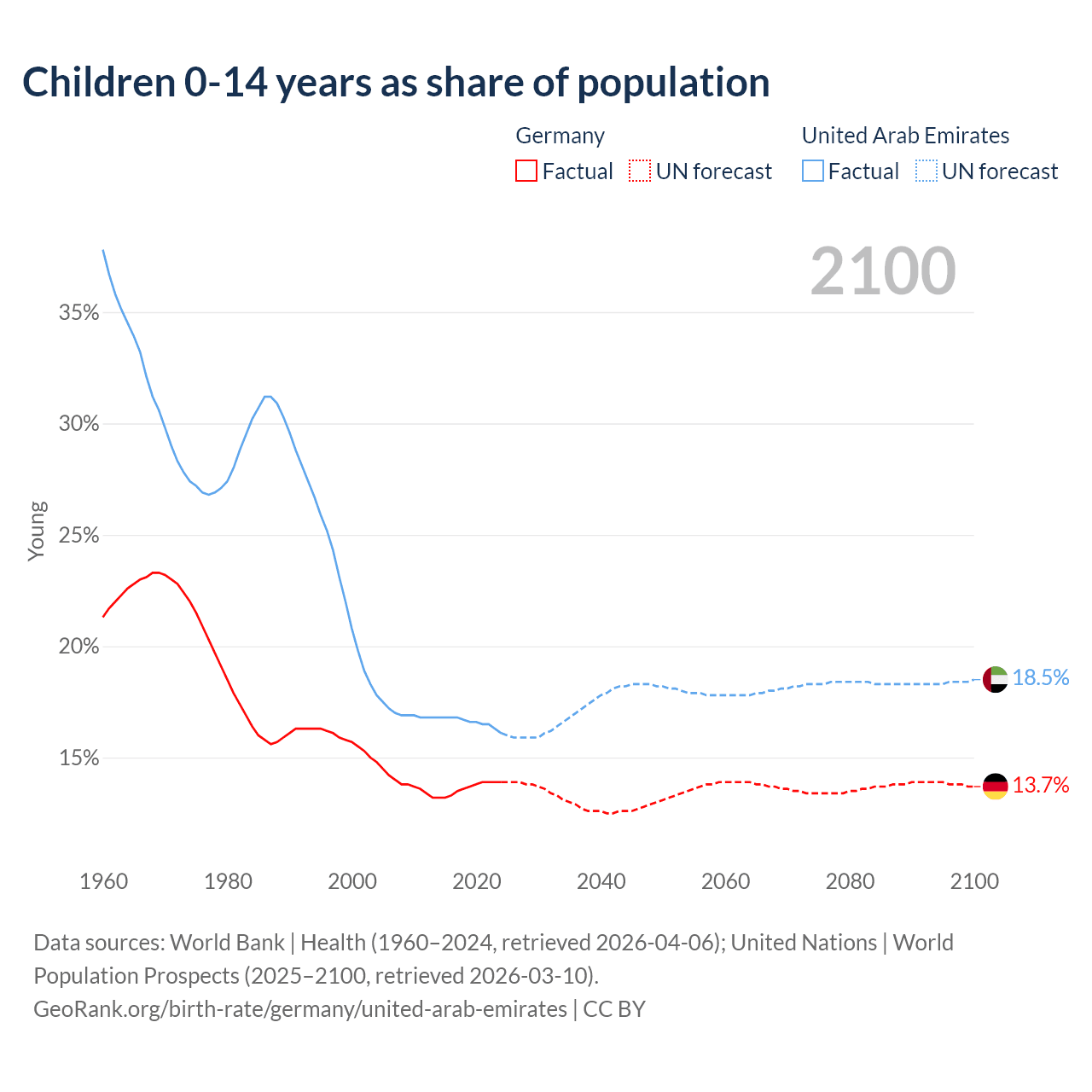 According to the latest available data on birth rates, the fertility rate in Germany was 1.39 children per woman in 2023, compared to 1.2 in the United Arab Emirates in 2023. The replacement level is considered to be 2.1 children per woman.