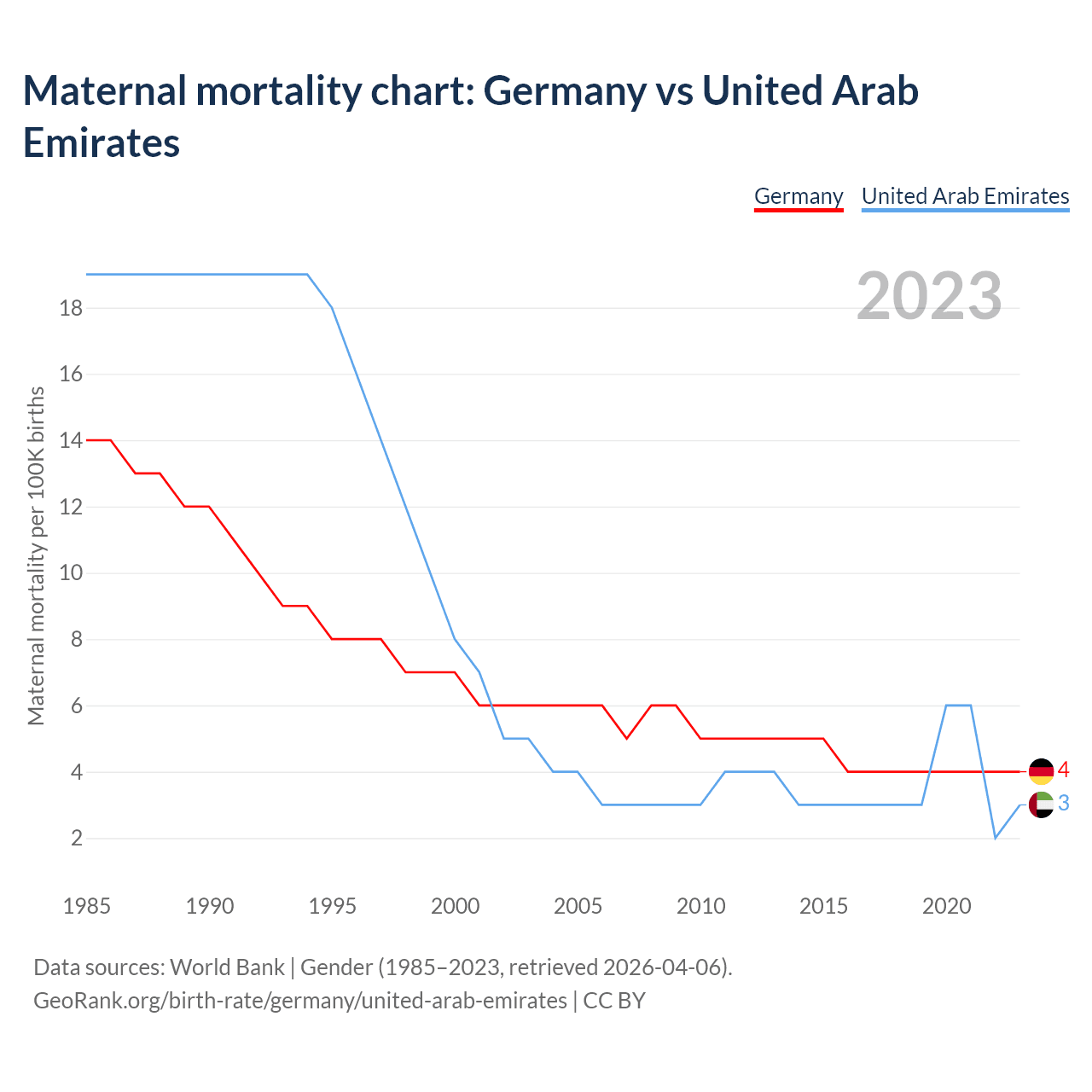 The maternal mortality rate, which is the probability of dying during childbirth or within 42 days of pregnancy termination, is 4 deaths per 100,000 live births in Germany, compared to 3 deaths in the United Arab Emirates.