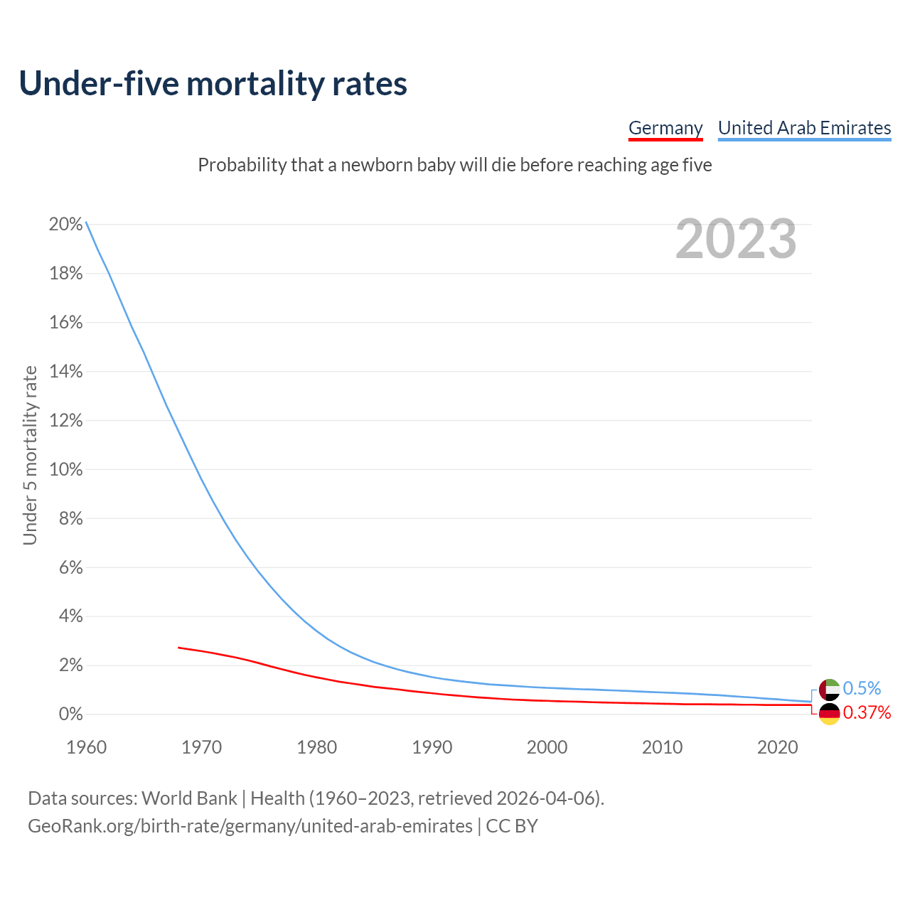 The chance that a newborn baby will die before reaching age five is 0.37% in Germany and 0.5% in the United Arab Emirates. Above is a chart with historical data on under-five mortality rates.