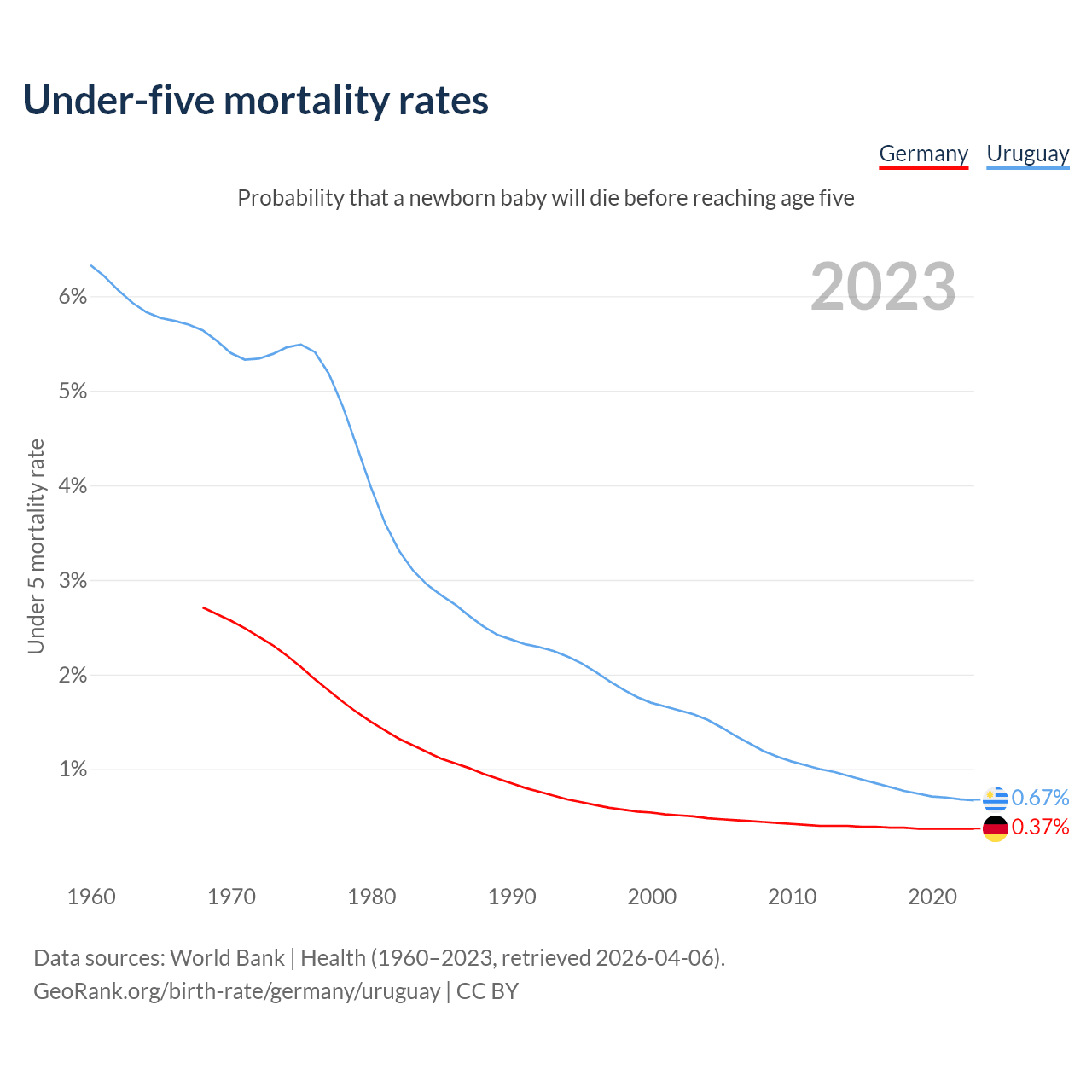 The chance that a newborn baby will die before reaching age five is 0.37% in Germany and 0.67% in Uruguay. Above is a chart with historical data on under-five mortality rates.