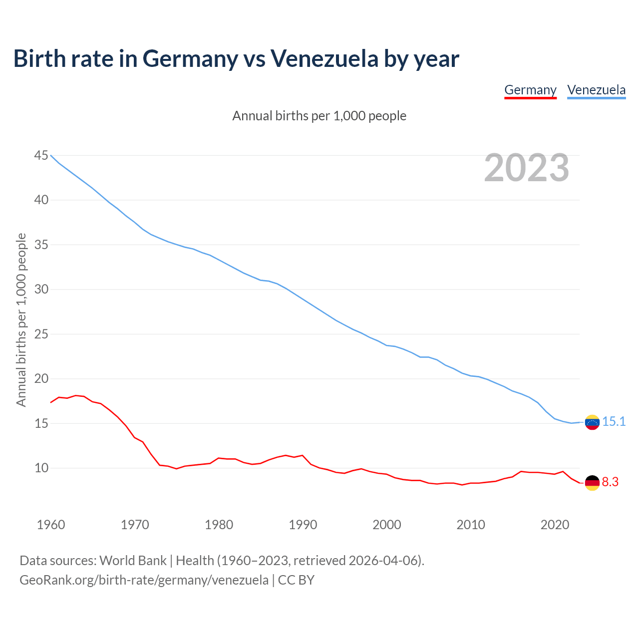 Germany has an annual birth rate of 8.3 births per 1,000 people, compared to 15.1 for Venezuela. The average number of children a woman is expected to have during her lifetime — the fertility rate, is 1.39 in Germany and 2.08 in Venezuela — 49.6% difference.
