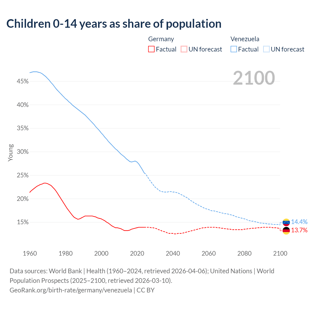 According to the latest available data on birth rates, the fertility rate in Germany was 1.39 children per woman in 2023, compared to 2.08 in Venezuela in 2023. The replacement level is considered to be 2.1 children per woman.
