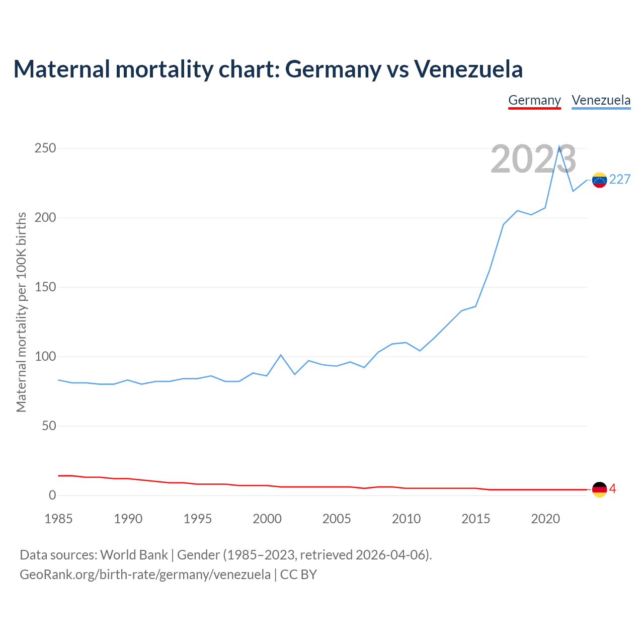 The maternal mortality rate, which is the probability of dying during childbirth or within 42 days of pregnancy termination, is 4 deaths per 100,000 live births in Germany, compared to 227 deaths in Venezuela.