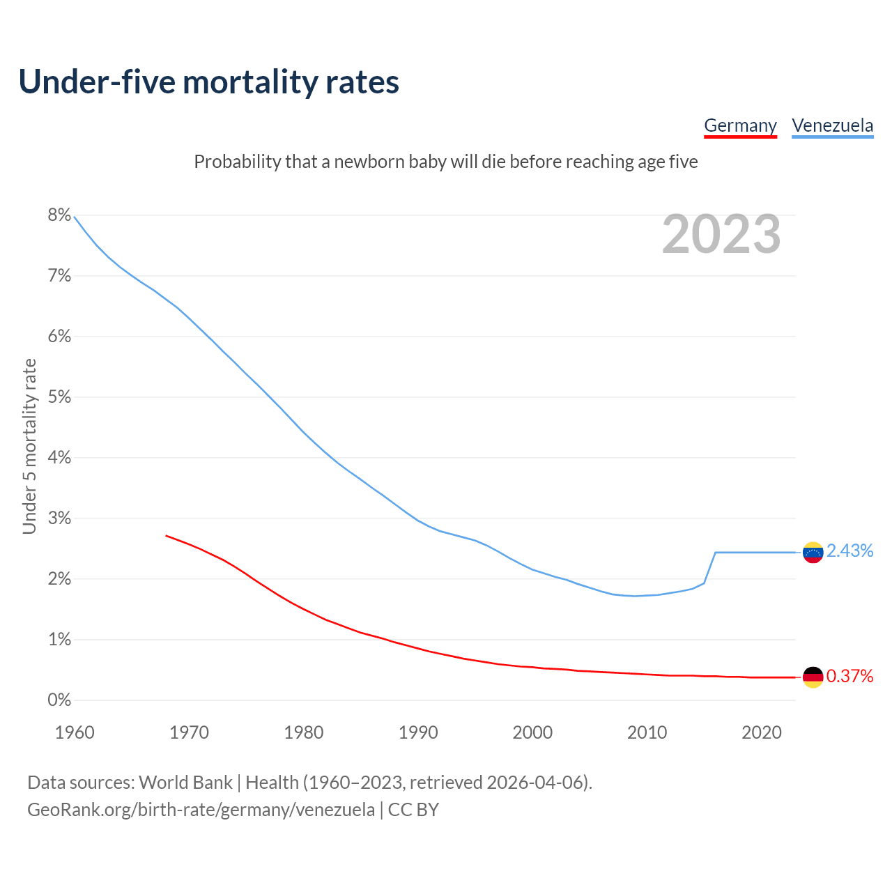 The chance that a newborn baby will die before reaching age five is 0.37% in Germany and 2.43% in Venezuela. Above is a chart with historical data on under-five mortality rates.
