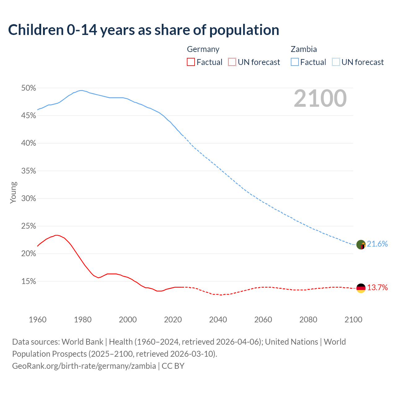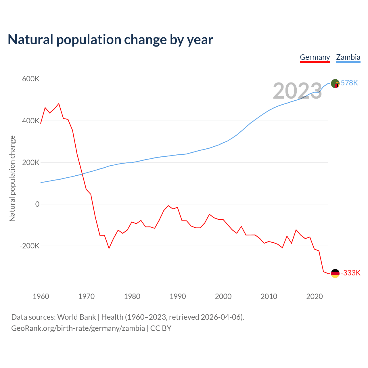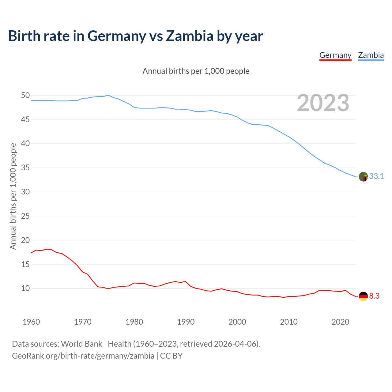 Germany has an annual birth rate of 8.3 births per 1,000 people, compared to 33.1 for Zambia. The average number of children a woman is expected to have during her lifetime — the fertility rate, is 1.39 in Germany and 4.1 in Zambia — 195% difference.